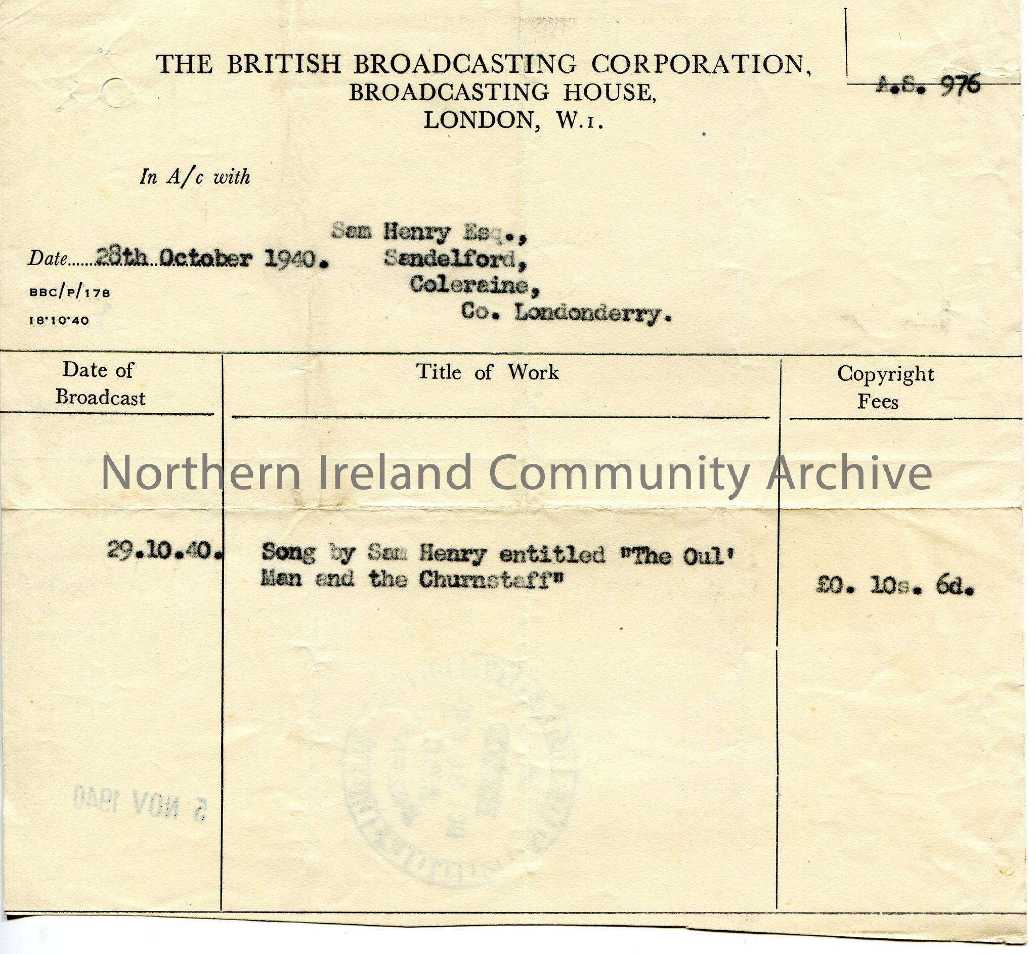 Typed receipt to Sam Henry, Sandelford, Coleraine, Co.Londonderry for use of song - 'The Oul' Man and the Churn Staff'. £0. 10s. 6d copyright fee. 29th October, 1940 is the date it was broadcast. BBC Belfast received stamp dated 30th October, 1940 and stamp dated 5th November, 1940 on back of page.
