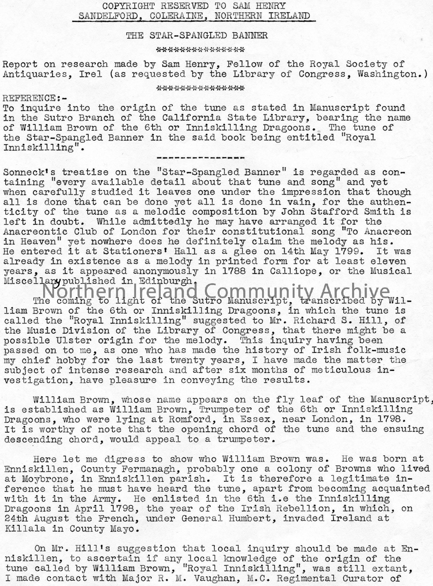Typed report on research made by Sam Henry re "The Star-Spangled Banner". "To inquire into the origin of the tune as stated in Manuscript found in the Sutro Branch of the California State Library, bearing the name of William Brown of the 6th or Inniskilling Dragoons. The tune of the Star-Spangled Banner in the said book being entitled "Royal Inniskilling".