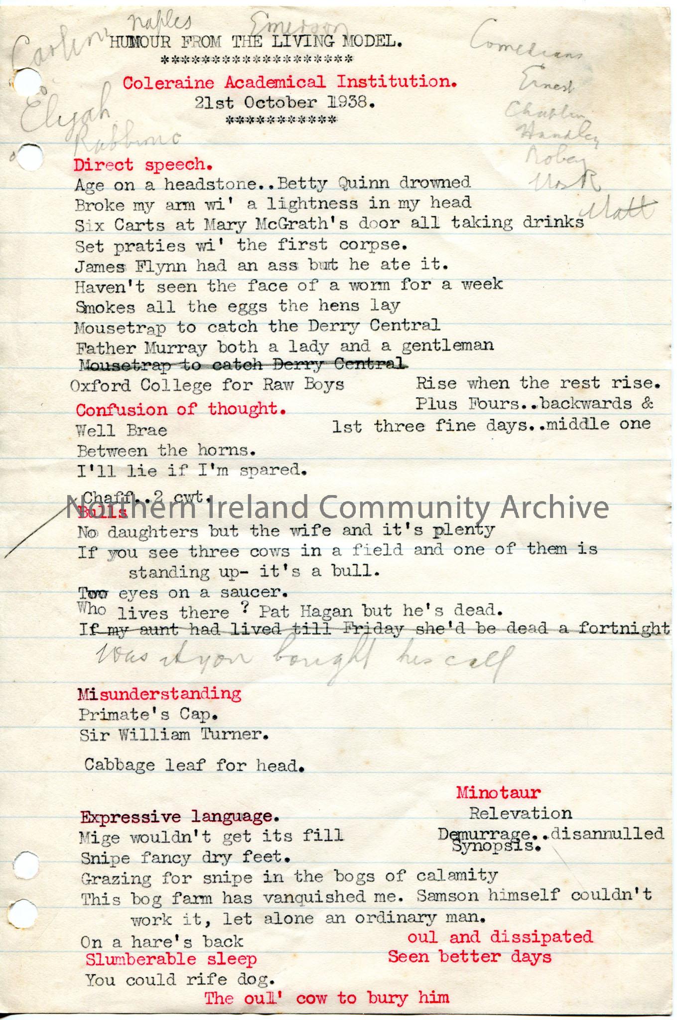 Typed rough notes for lecture titled, ‘Humour From the Living Model’ at Coleraine Academical Institution on 21st October, 1938.