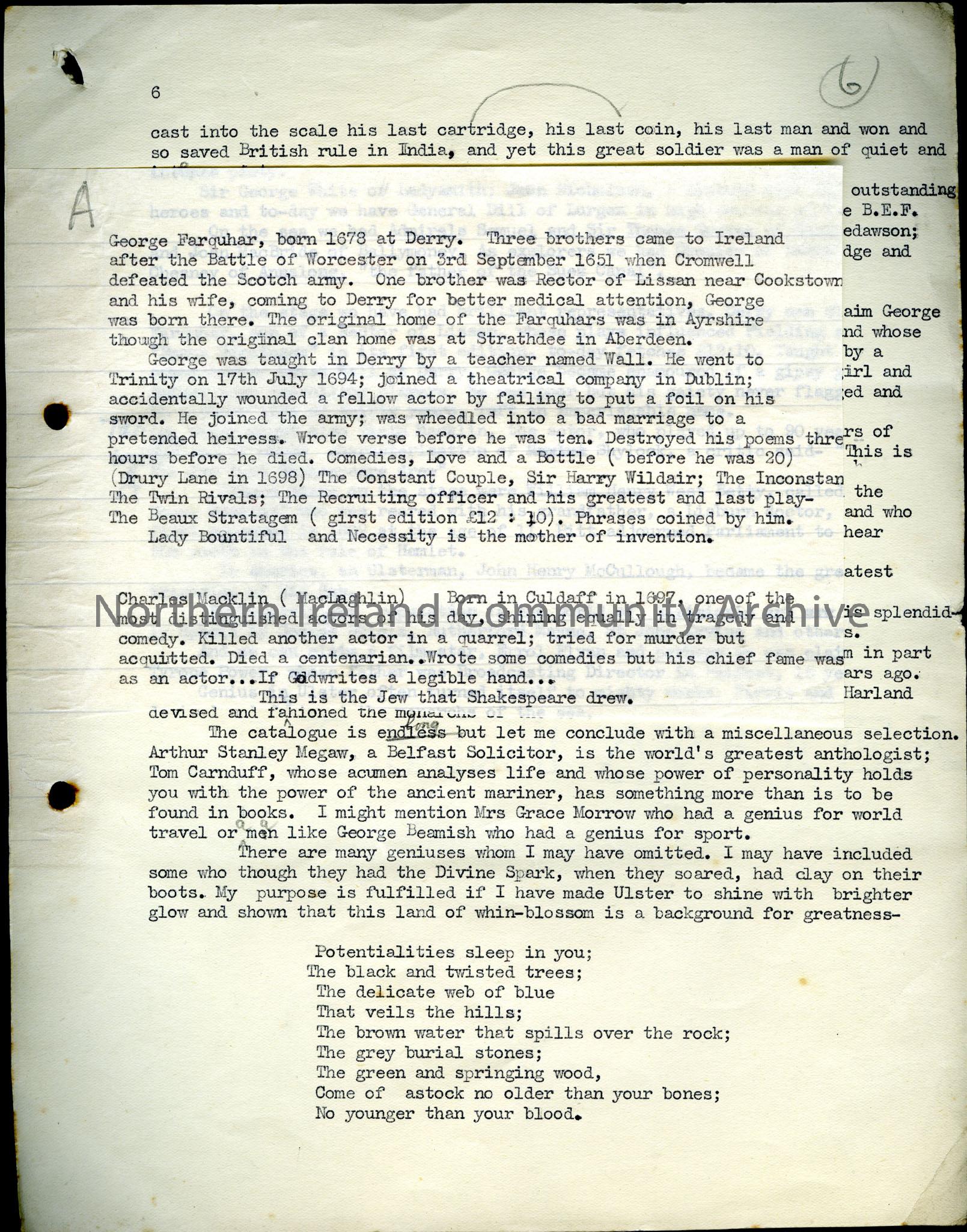 Typed script?, 6 pages, titled 'The Divine Spark. A Study of Ulster Genius. Belfast Rotary, 17th June 1940'. Hugh Thomson, Arthur David McCormick, Rev. W. F. Marshall, Denis Hempson, Arthur O'Neill and others.