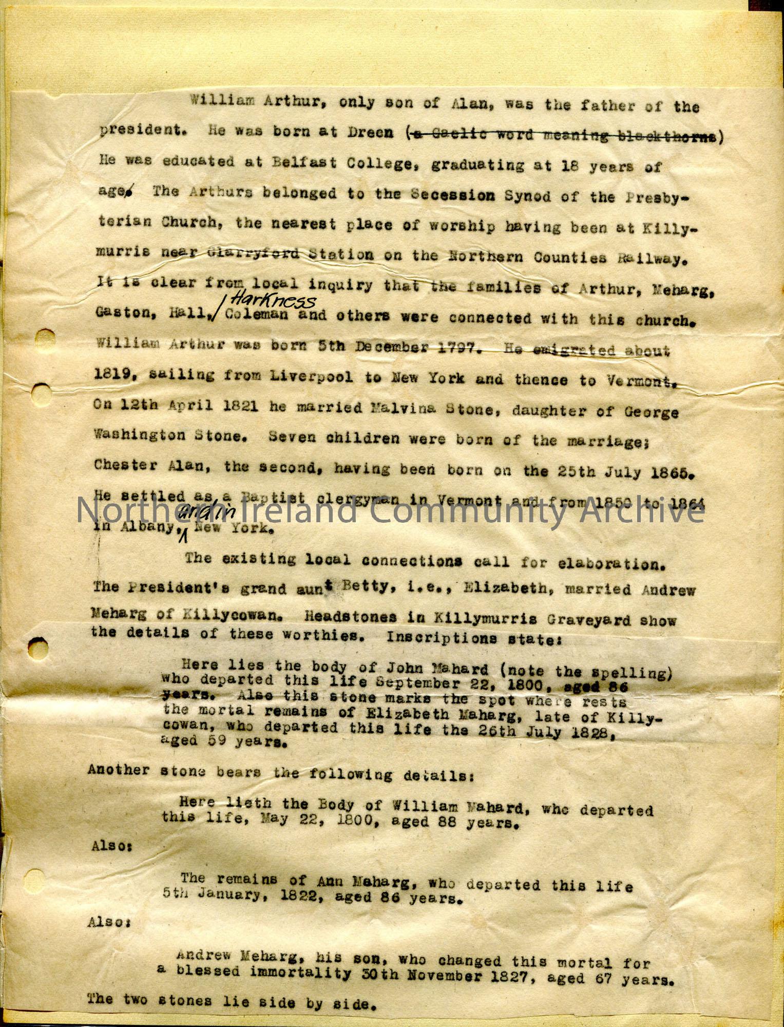Typed script on tissue paper affixed to page President Arthur's father and grandfather - marriage, church, migration, links with Meharg family [several spellings of name noted] through marriage, headstone recording from Killymurris