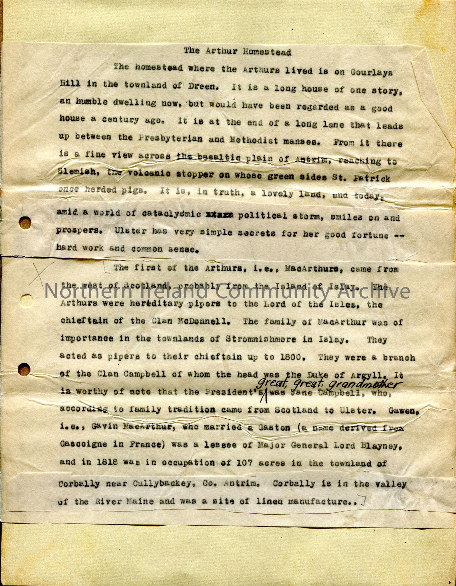 Typed script on tissue paper affixed to page, under heading 'The Arthur Homestead'. Description of Arthur cottage location, background of MacArthurs as possible from Islay and hereditary pipers to Lords of the Isles
