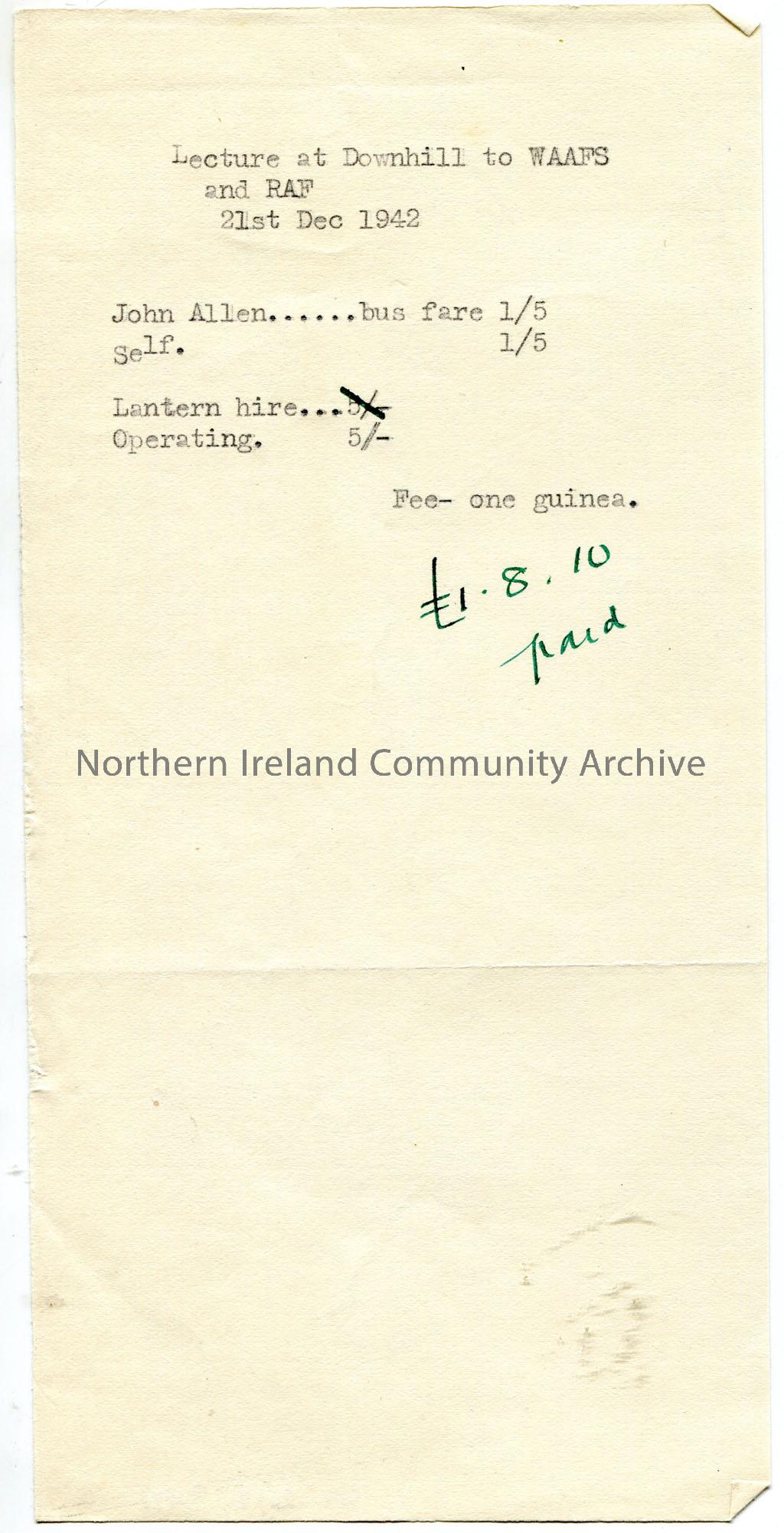 Typed short note re expenses of a lecture at Downhill to WAAFS and RAF on 21st December 1942. Mentions John Allen who was most likely the lantern operator. Fee of £1.8.10 paid.