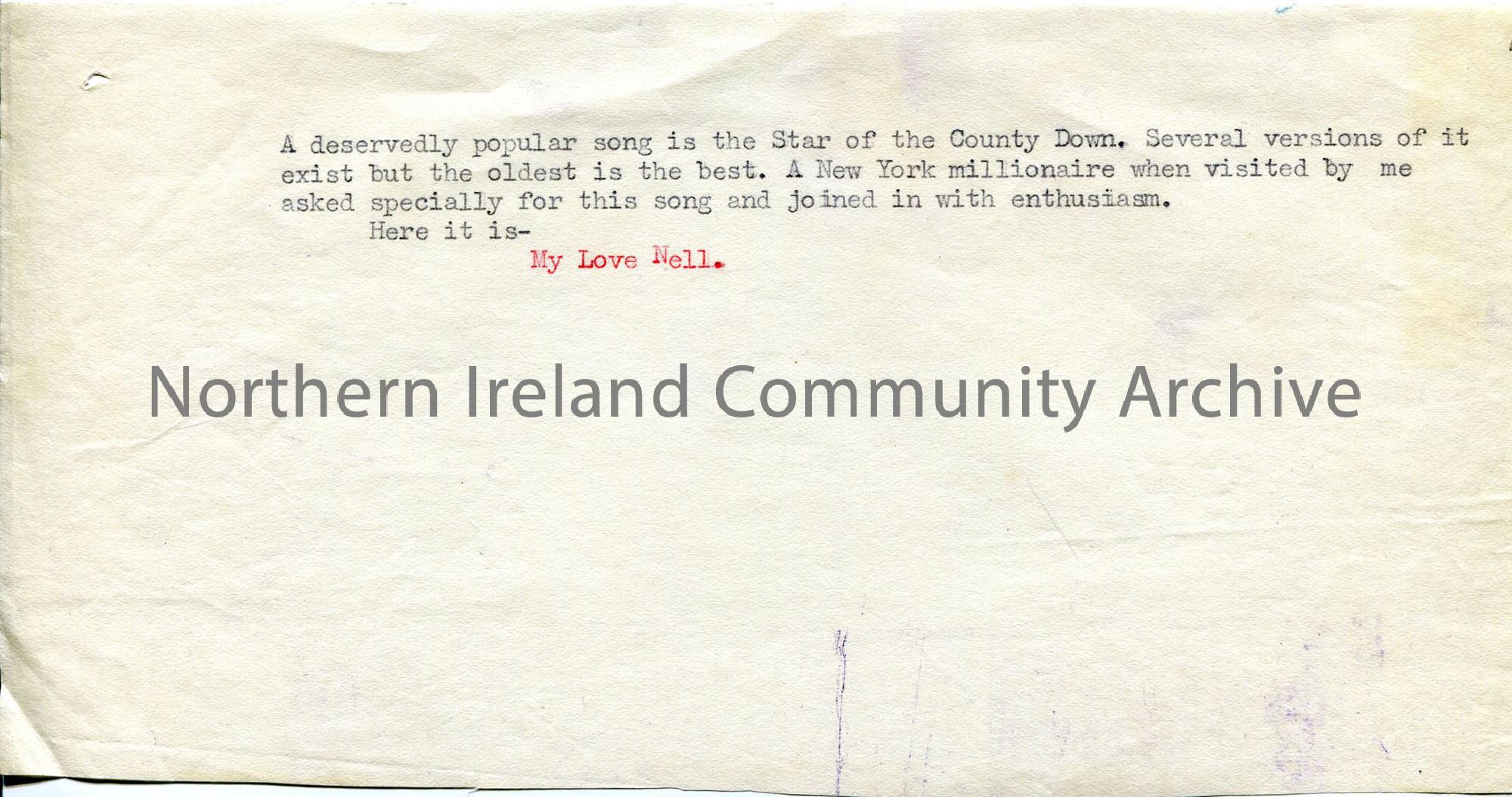 Typed short paragraph about popular song from County Down – ? part of whole script on ballads. Number ‘4’ handwritten top right
