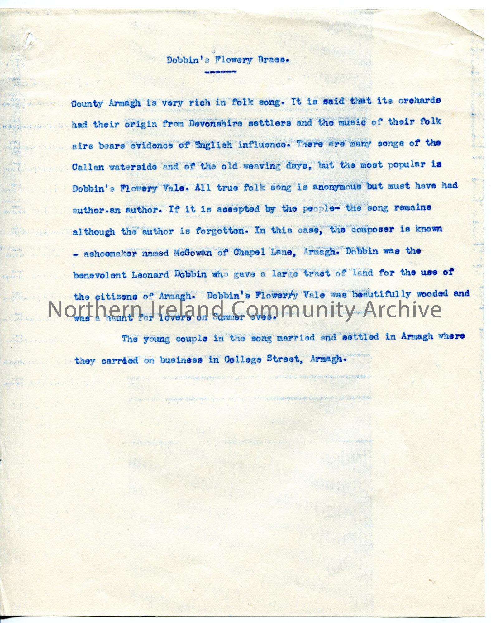 Typed short script under heading ‘Dobbin’s Flowery Braes’ – a County Armagh song – information about composer and content of song. Actual song not inc…