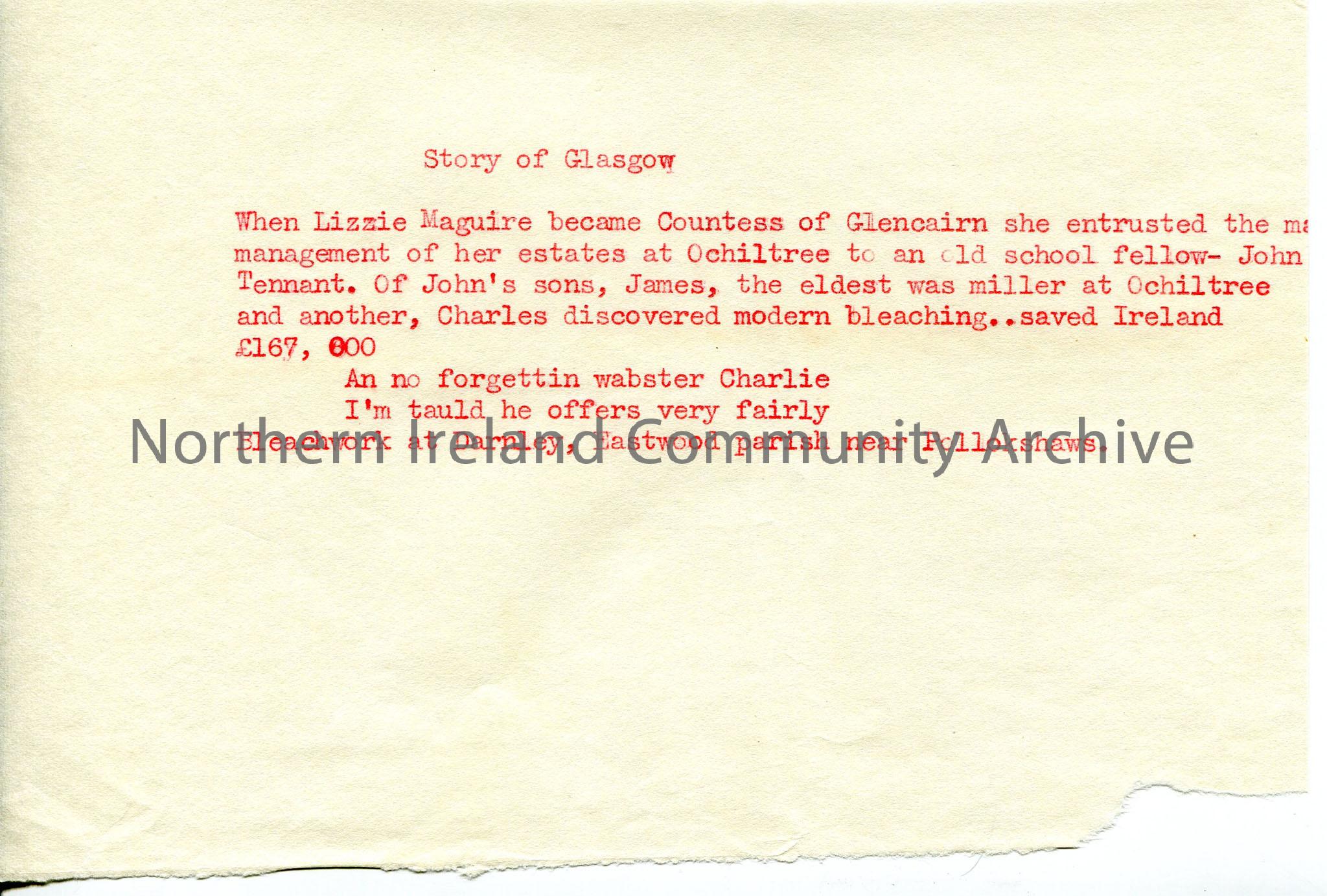 Typed short script under heading 'Story of Glasgow', with mention of a John Tennant. Uses local dialect.