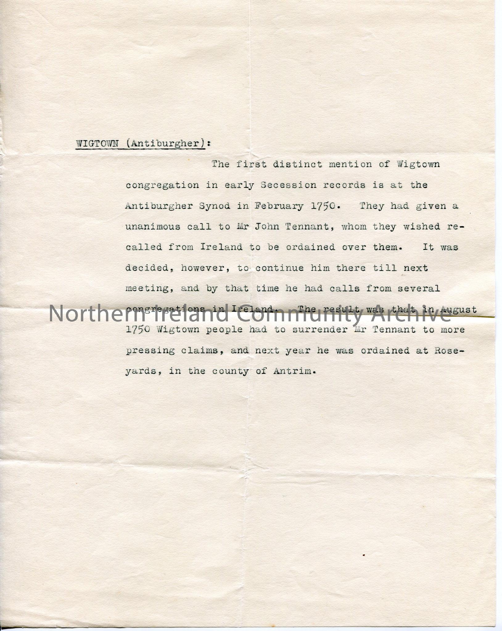Typed short script under heading ‘Wigtown (Antiburgher)’ – church had ‘called’ John Tennant but he had several claims and was ordained at Roseyards in…