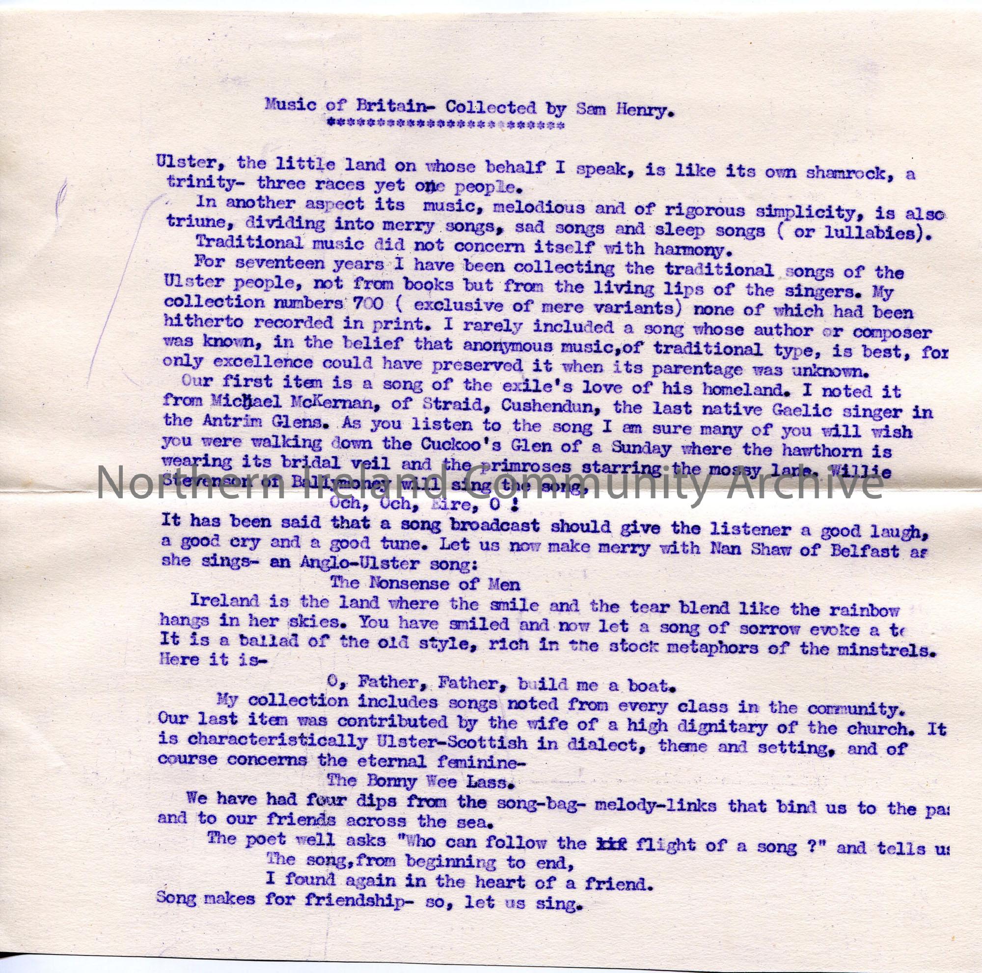 Typed short script under title ‘Music of Britain – Collected by Sam Henry’, including his work in collecting and reference to ‘The Bonny Wee Lass’ as …