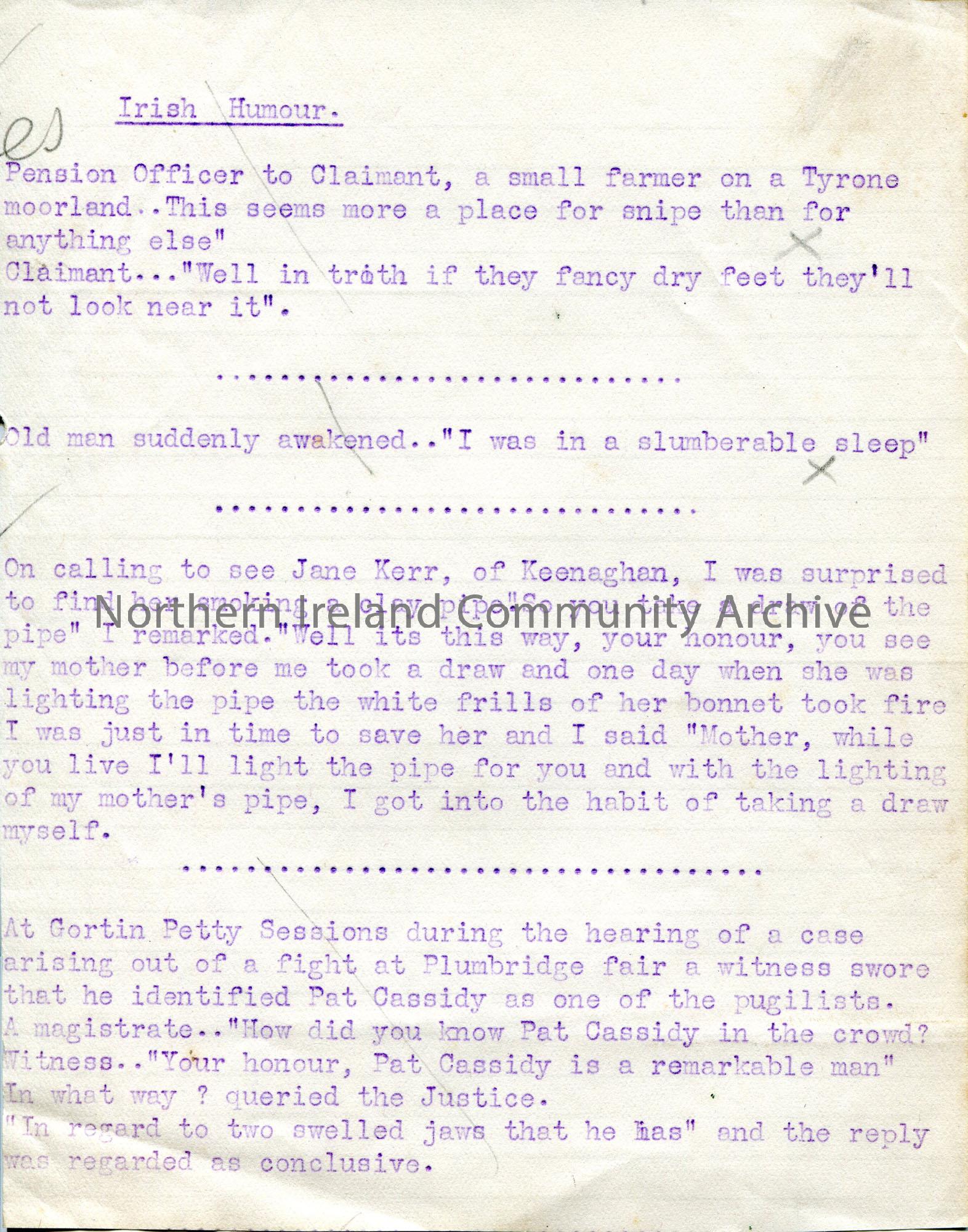 Typed short stories titled, ‘Irish Humour’.