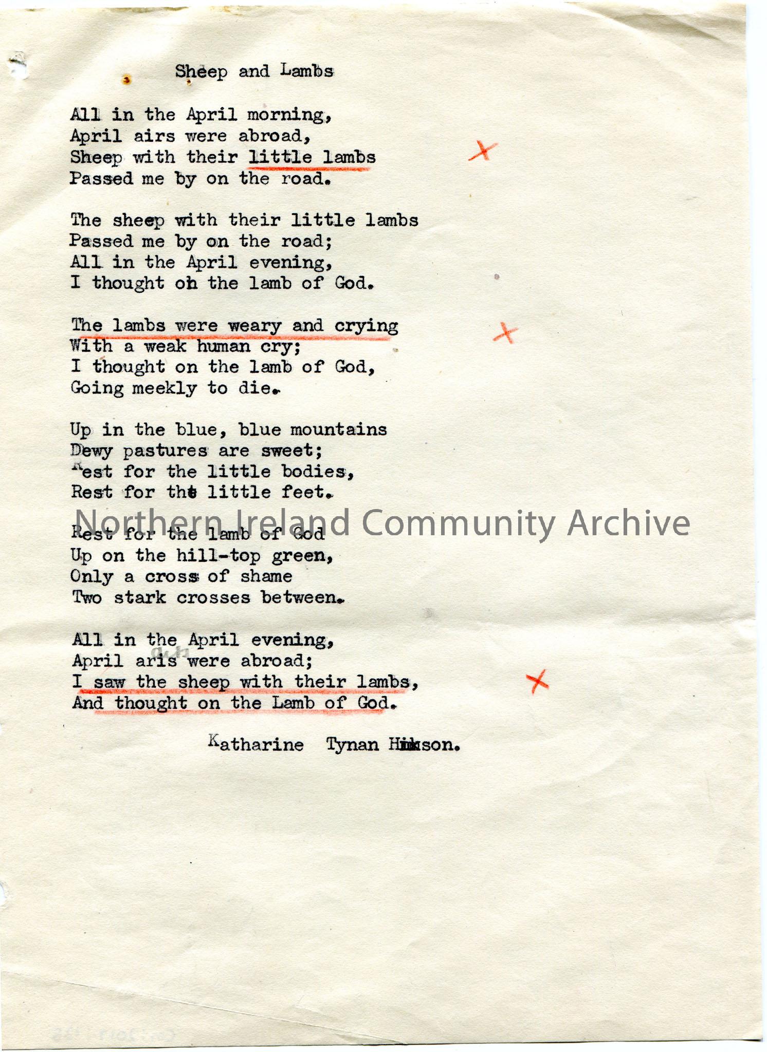 Typed six verses of a poem or words to a song titled, ‘Sheep and Lambs’, by Katharine Tynan Hinkson. Some lines underlined in red with an X beside eac…