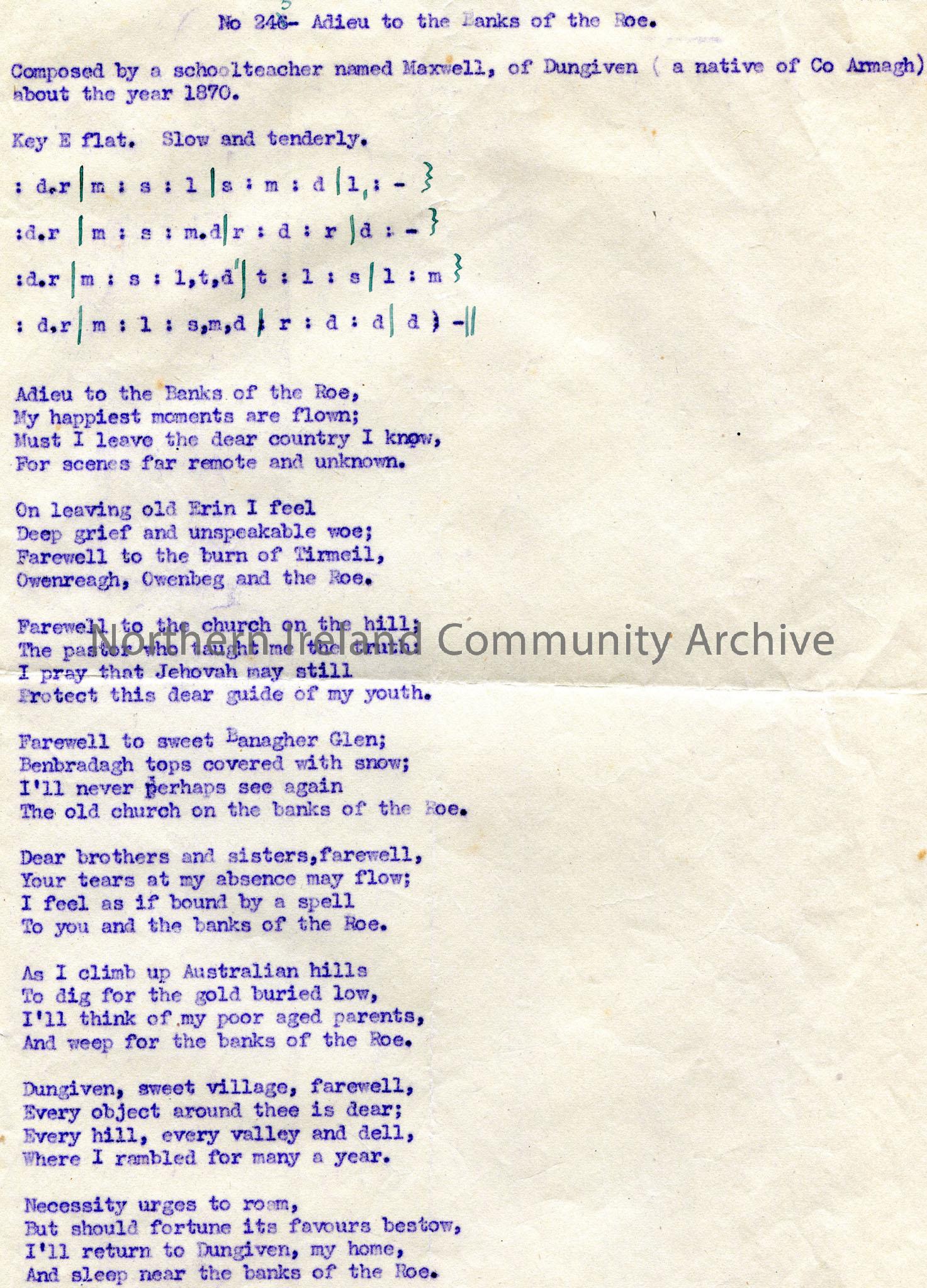 Typed song, 8 verses, and tonic sol-fa notation titled, 'Adieu to the Banks of the Roe'. No. 245. 'Composed by a schoolteacher, Maxwell of Dungiven (a native of Co Armagh) about the year 1870'. Song mentions Banagher Glen, Dungiven, Owenreagh and Owenbeg.