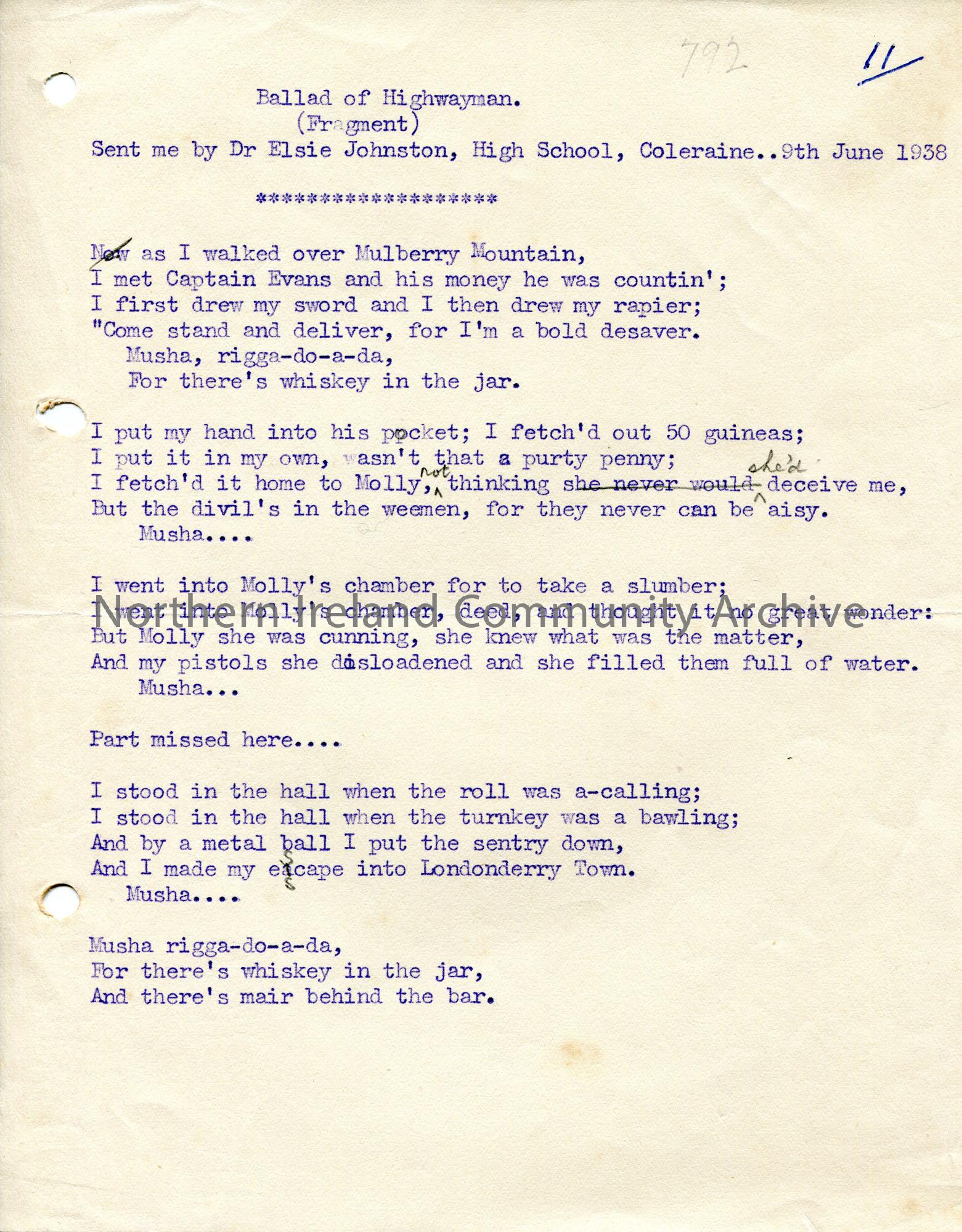 Typed song ‘Ballad of Highwayman’ with part missing. Note re donor – ‘Sent me by Dr Elsie Johnston, High School, Coleraine..9th June 1938’.
