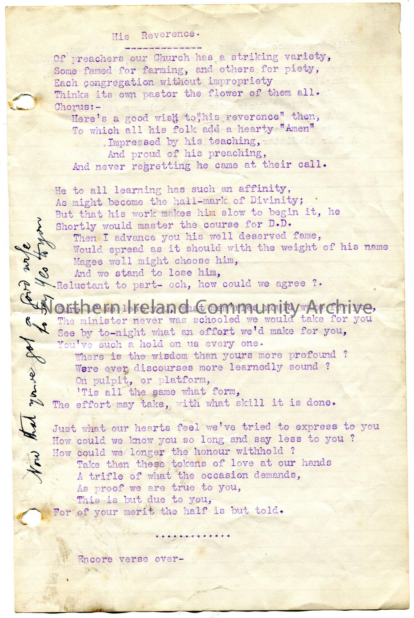Typed song (double sided) titled, 'His Reverence' by Sam Henry. 'The Rev Joseph' handwritten in pencil at end of song. 'Now that you've got a good wife to say yes to you' handwritten in black ink alongside words of song on left side.