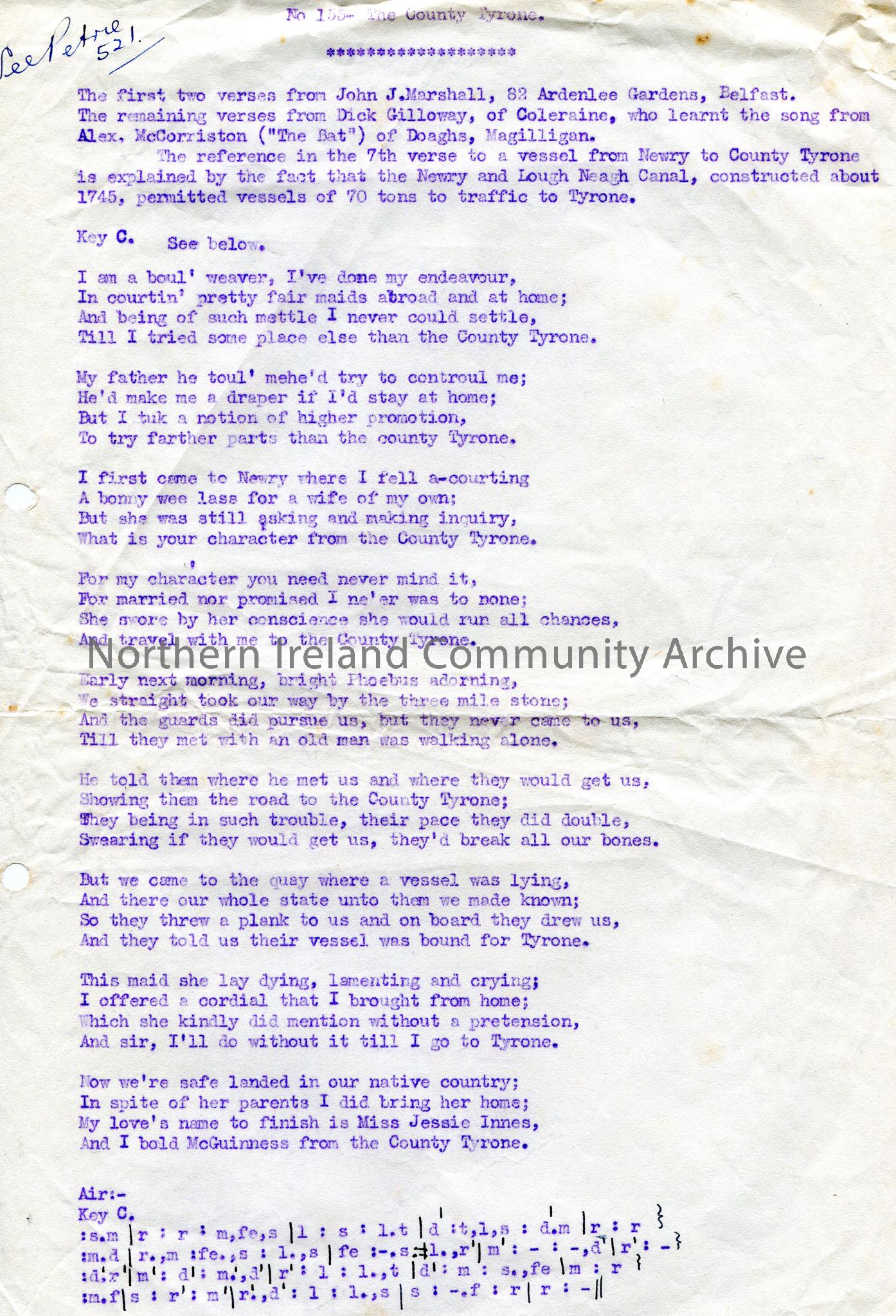 Typed song, nine verses, and tonic sol-fa notation titled, ‘The County Tyrone’. No. 153. Verses are from John J Marshall, 82 Ardenlee Gardens, Belfast…