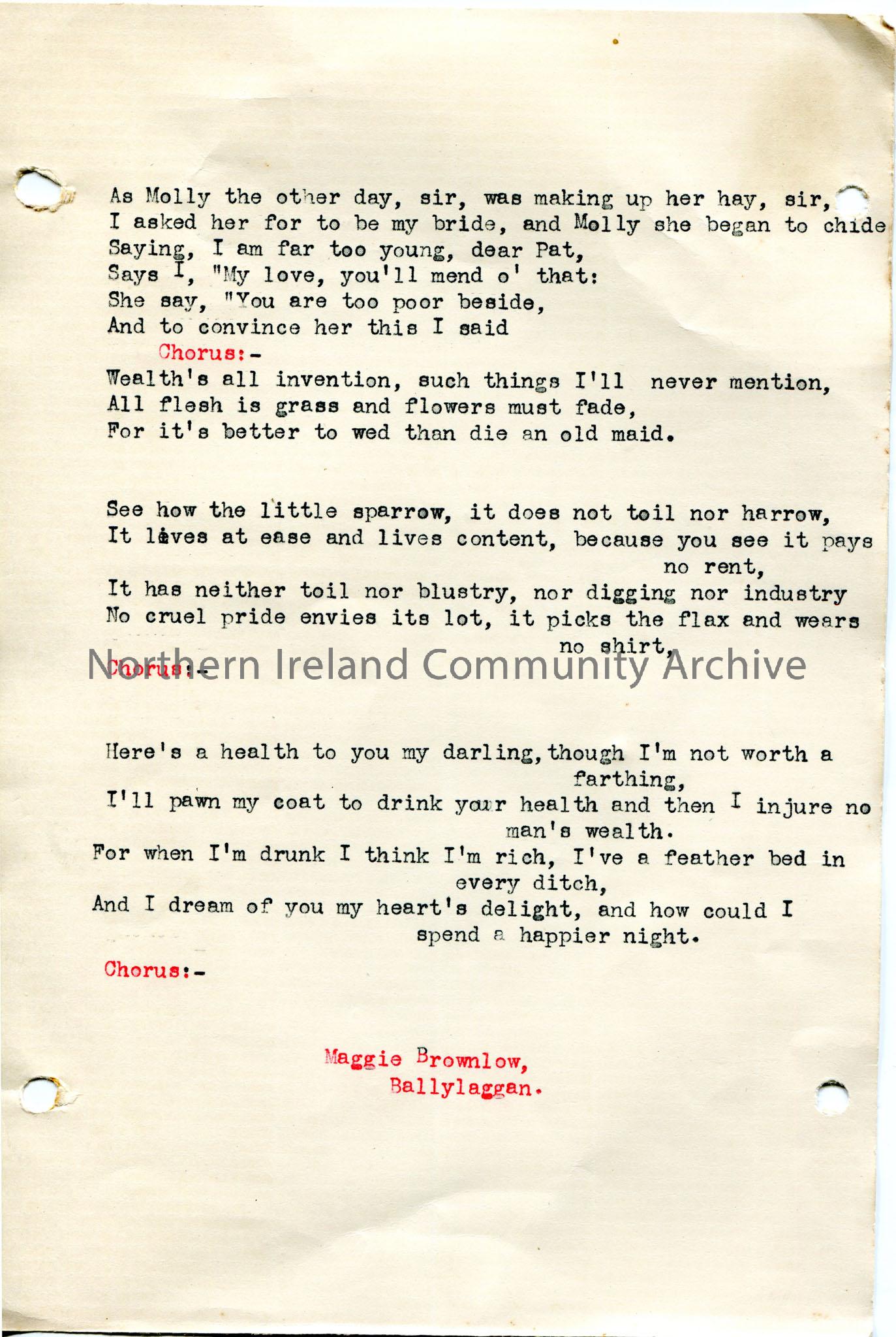 Typed song, no title. ‘Maggie Brownlow, Ballylaggan’ typed at bottom of page.