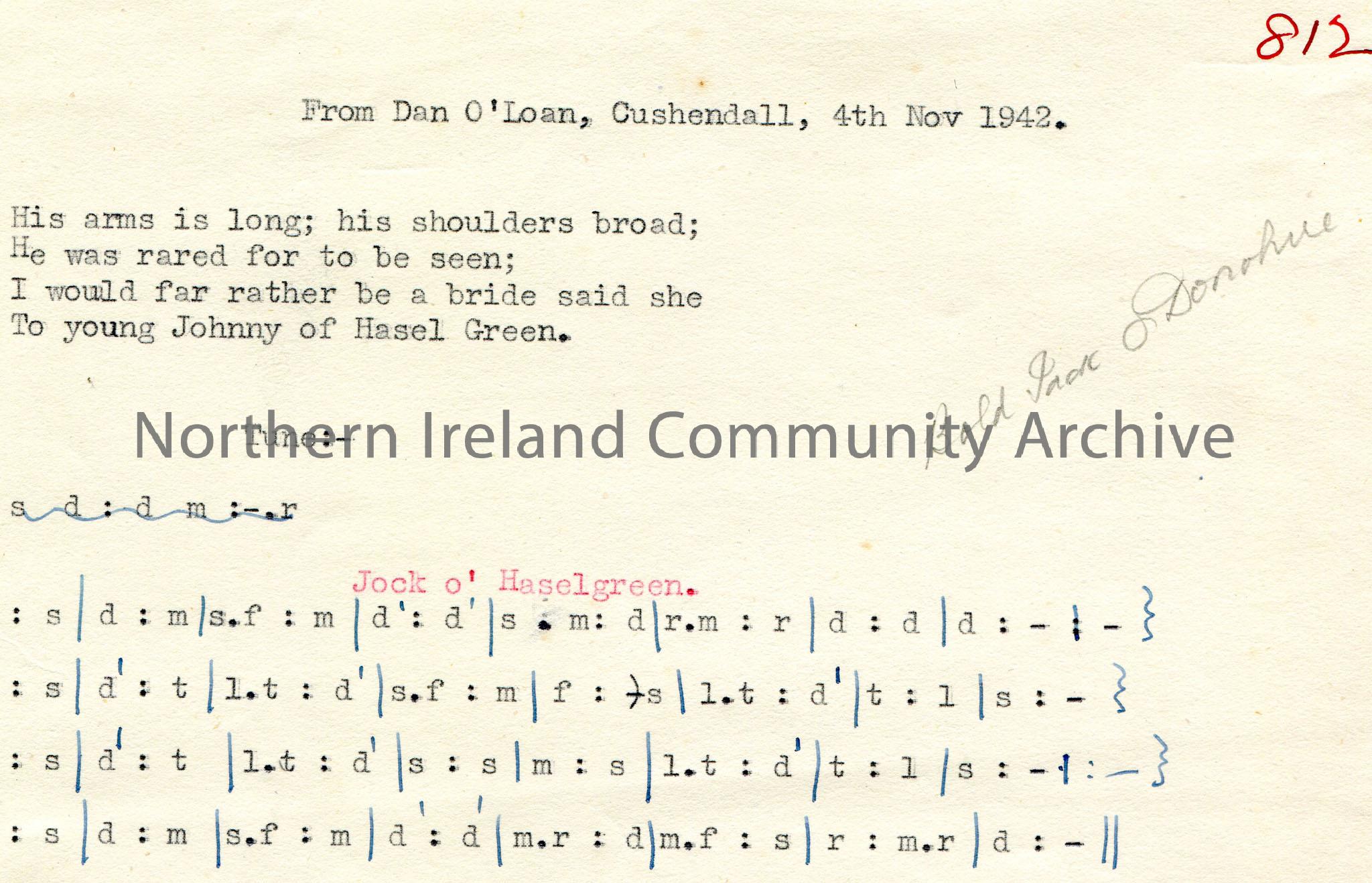 Typed song, one verse, and tonic sol-fa notation from Dan O’Loan, Cushendall, 4th November, 1942. Tonic sol-fa notation titled, ‘Jock Haselgreen’. ‘Bo…
