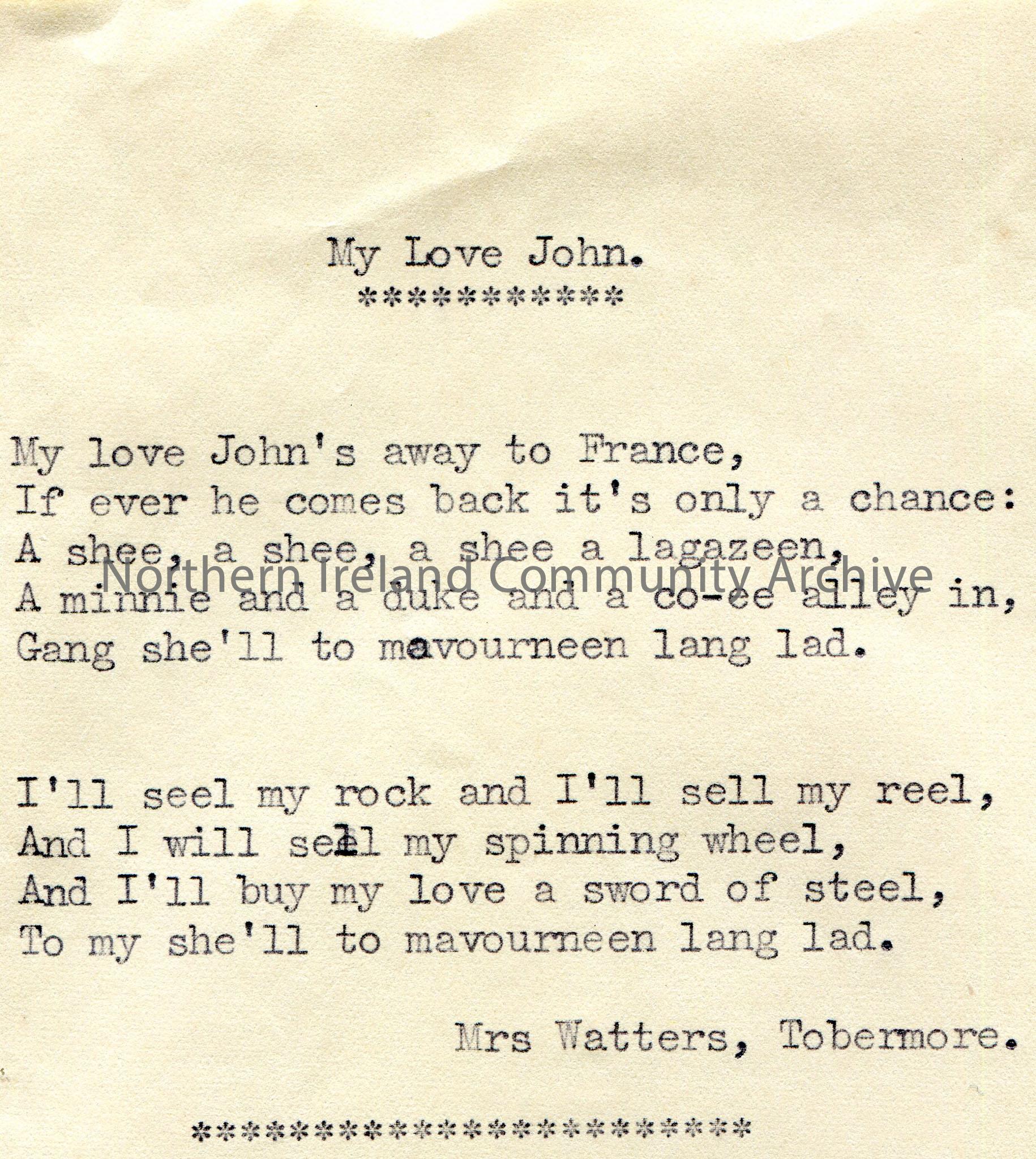Typed song or poem titled, ‘My Love John’. Two verses.