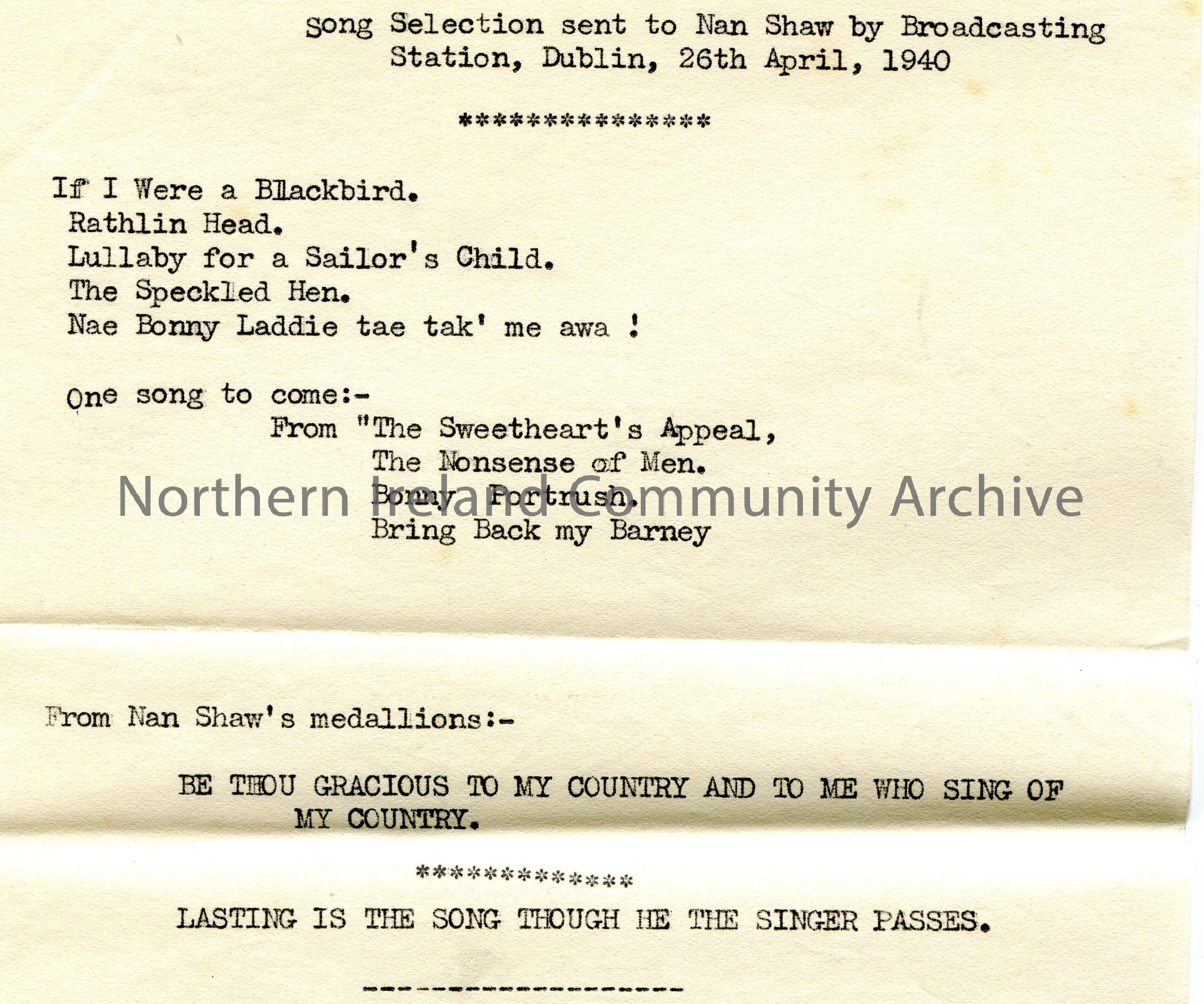 Typed song selection sent to Nan Shaw by Broadcasting Station, Dublin, 26th April, 1940.