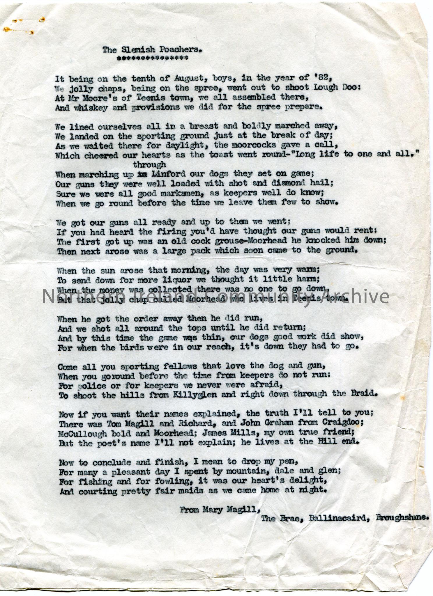 Typed song ‘The Slemish Poachers’.