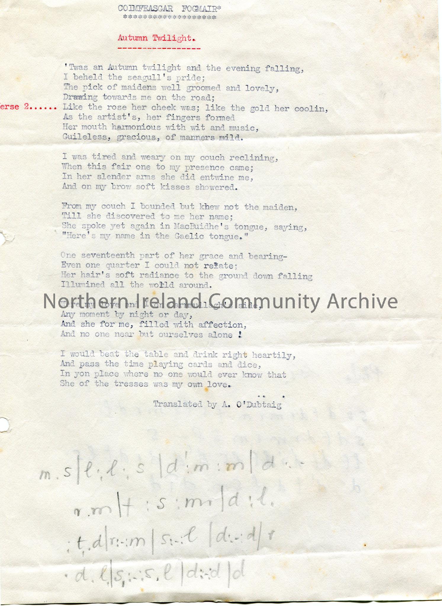 Typed song titled, ‘Autumn Twilight’. Translation from Coimfeasgar Fogmair. Song translated by A. O’Dubtaig. Tonic sol-fa notation written in pencil. …