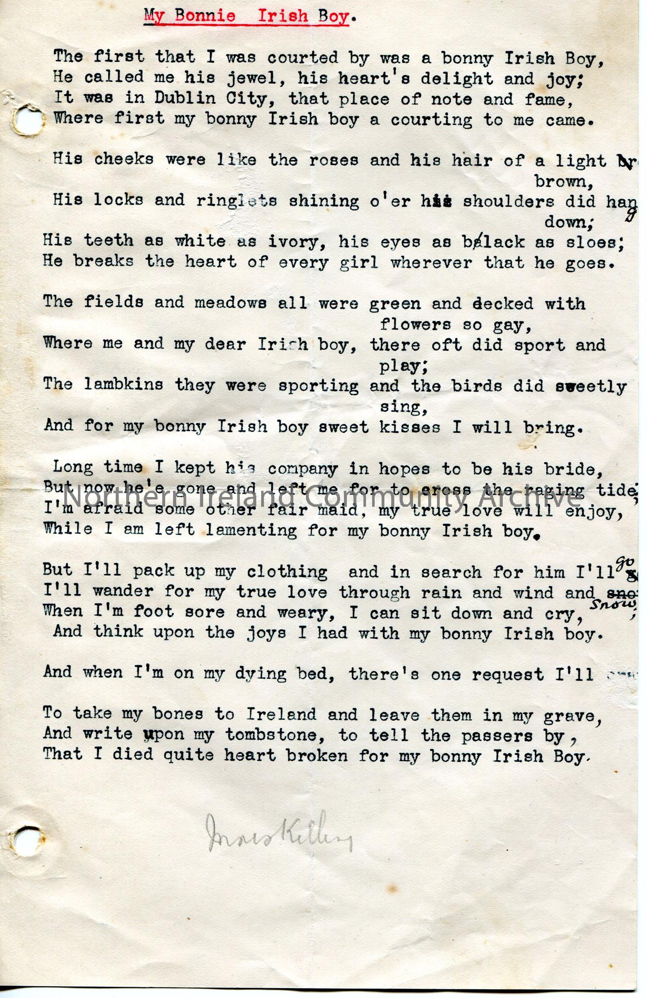 Typed song titled, ‘My Bonnie Irish Boy’. Mentions Dublin.