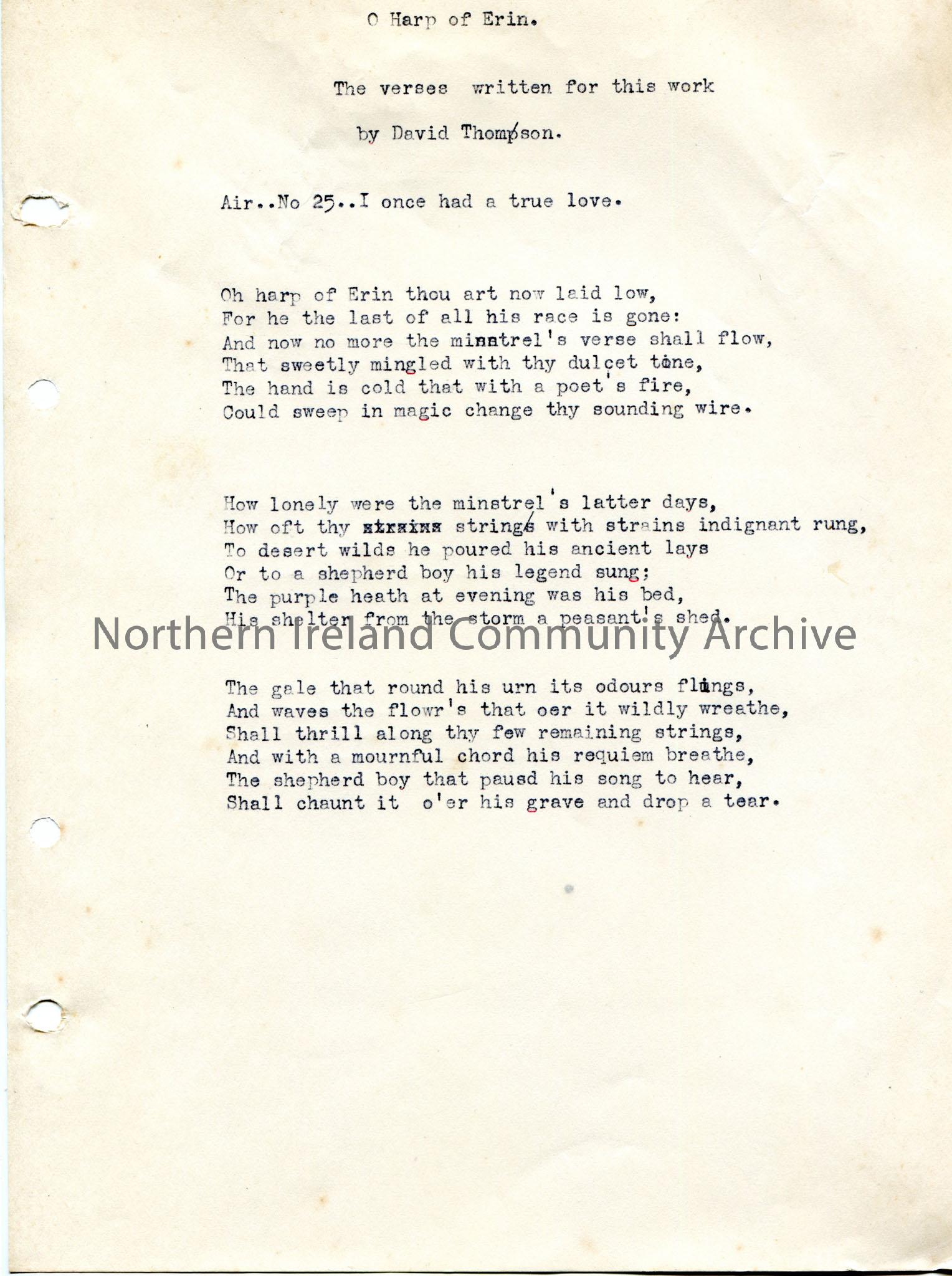 Typed song titled, ‘O Harp of Erin’. Written by David Thompson. ‘Air..No 25..I once had a true love’.