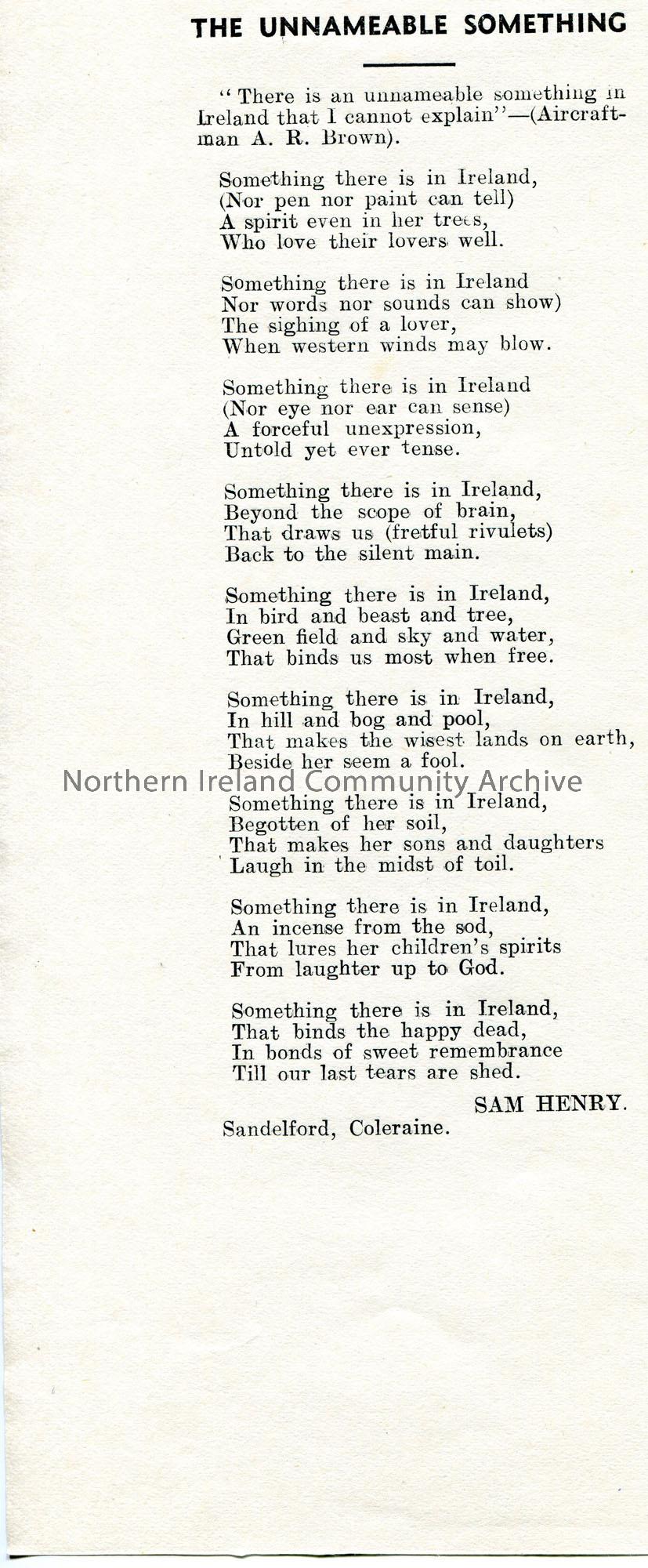 Typed song titled, ‘The Unnameable Something’. By Sam Henry, Sandelford, Coleraine. Re Ireland.