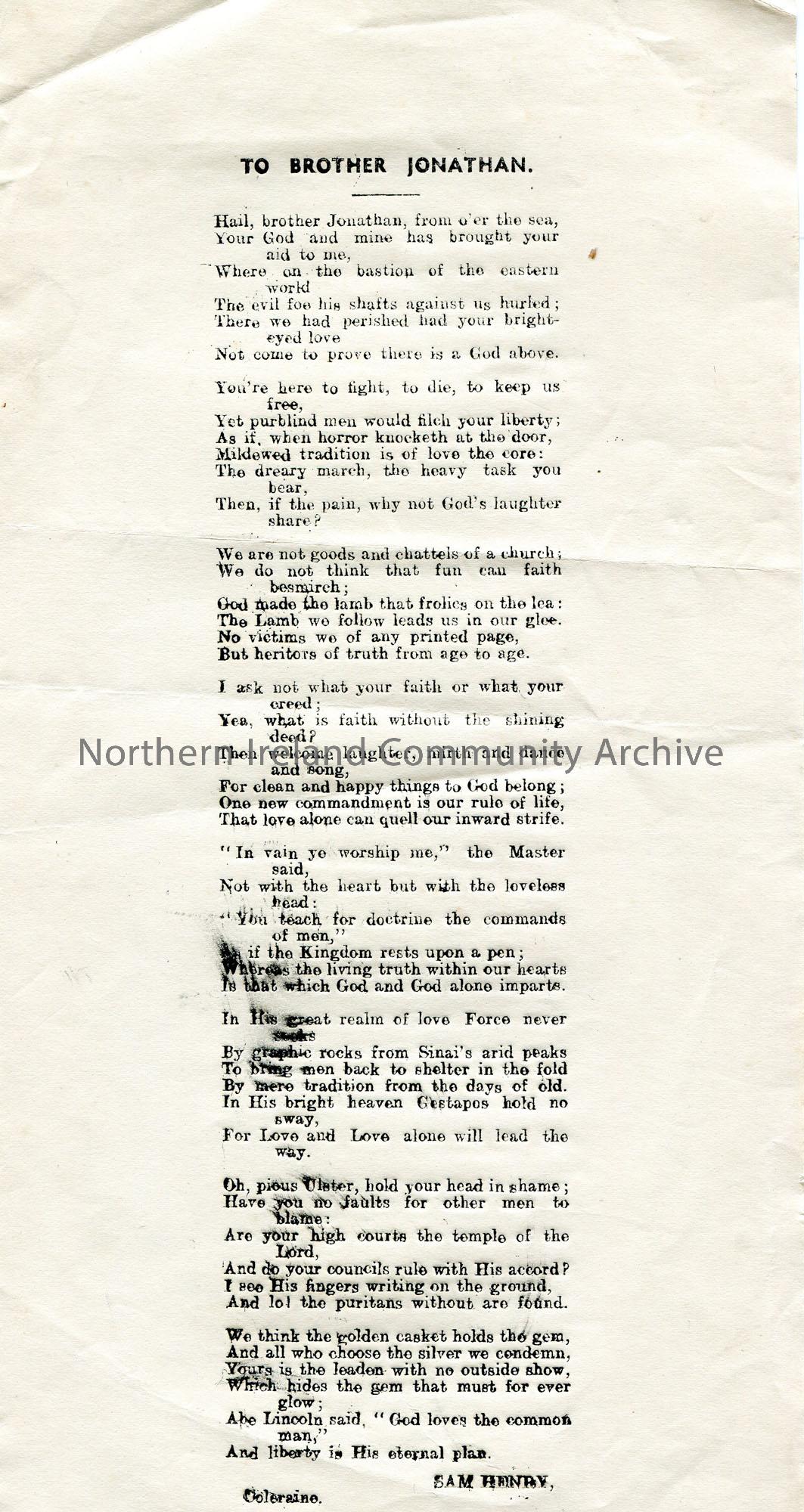 Typed song titled, ‘To Brother Jonathan’. By Sam Henry.