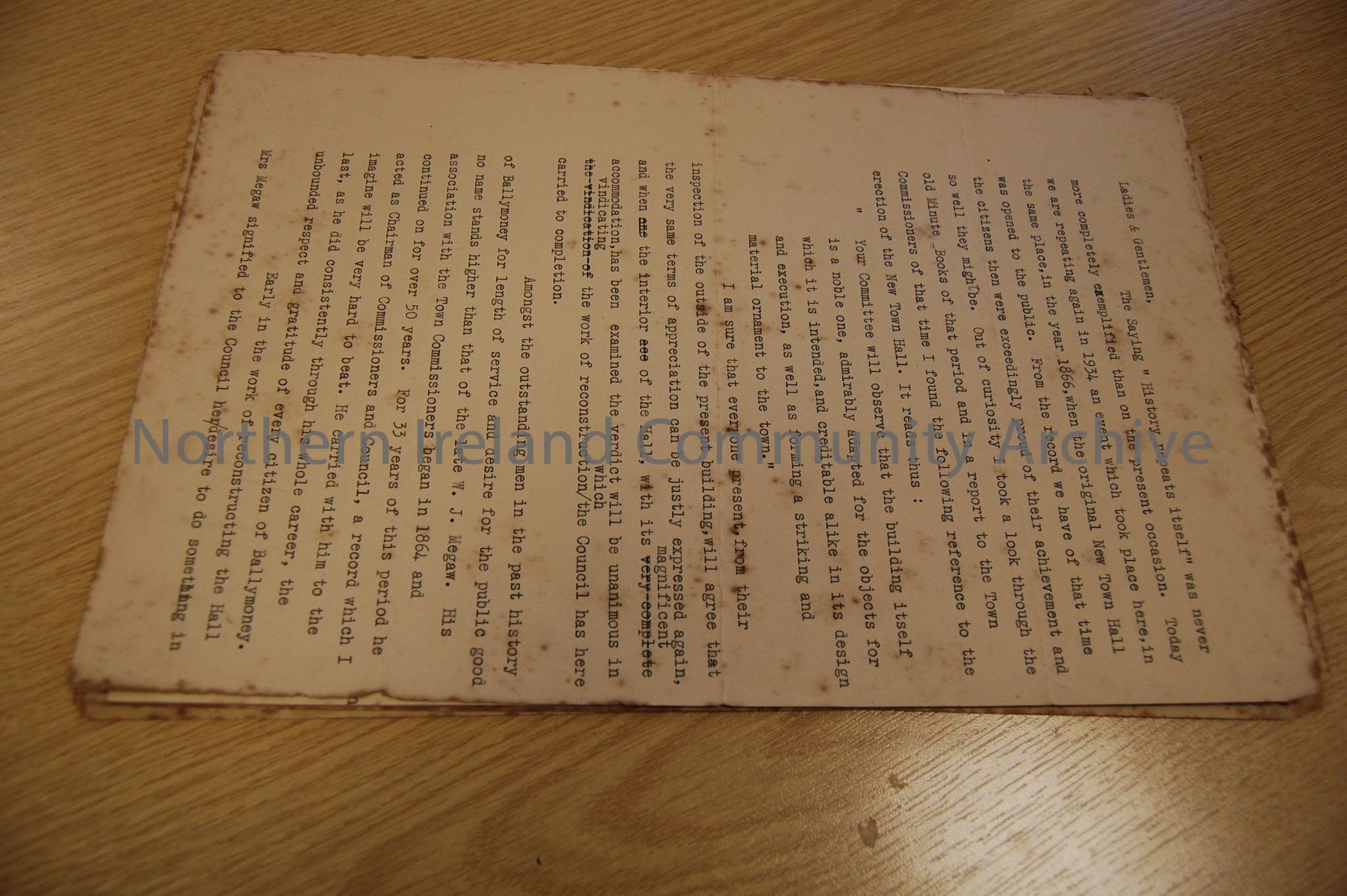 Typed speech by Chairman of Ballymoney Urban District Council, Luncheon seating plan and least of attendees and programme of events including the unveiling of portraits at the Reopening of the Town Hall, 16th February 1934
