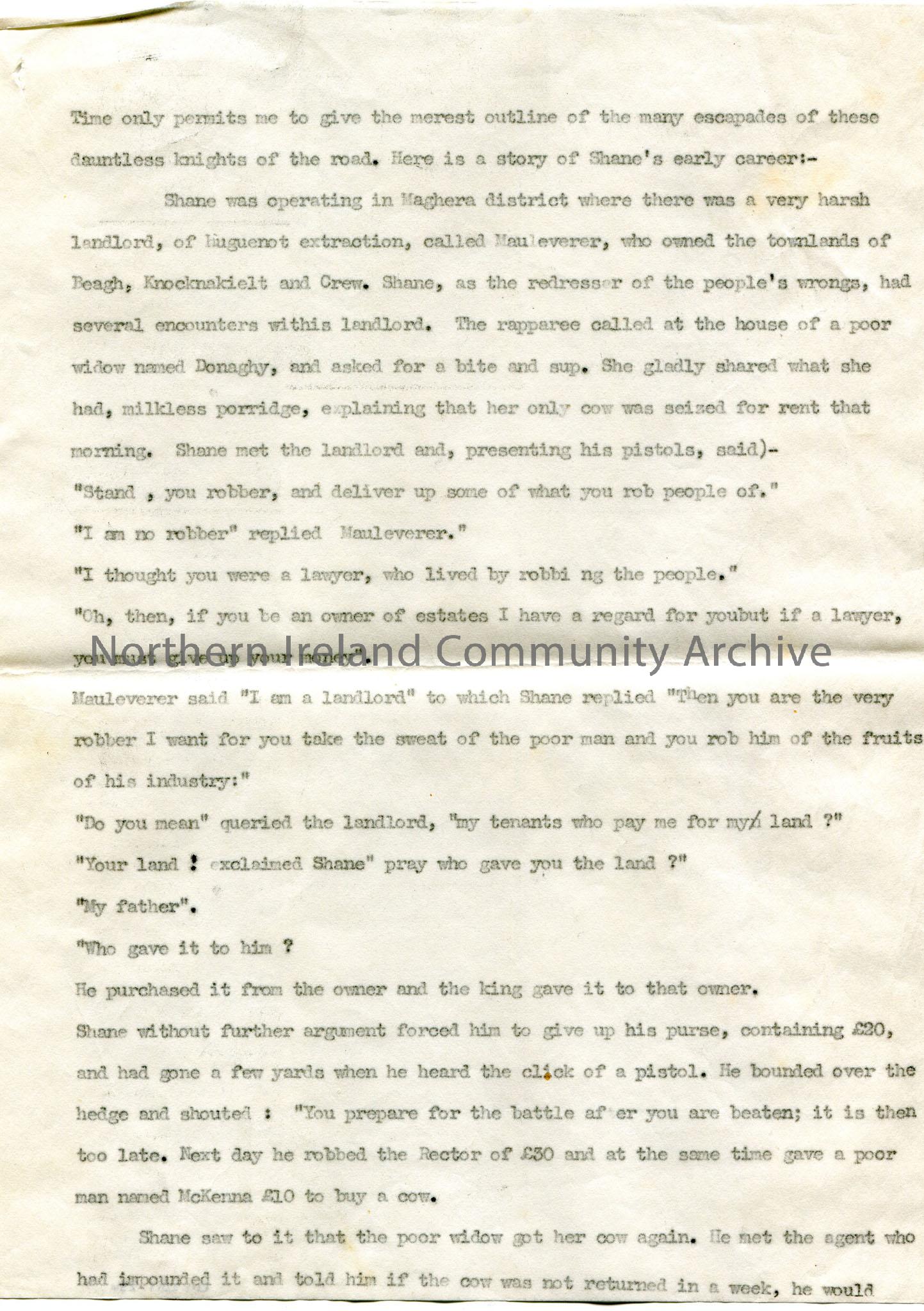 Typed story re Shane Crossagh helping a widow claim back her cow which was taken from her by her landlord for rent. He also robbed a Rector and gave t…