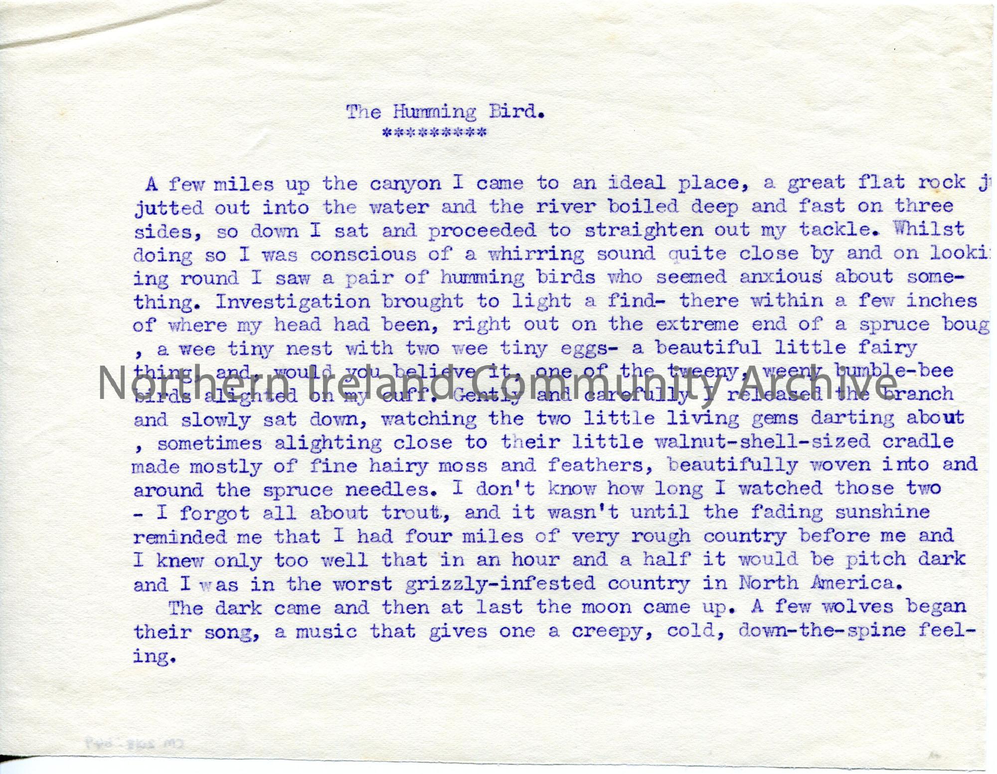 Typed story titled, ‘The Humming bird’. Re birdwatching a pair of humming birds in North America.