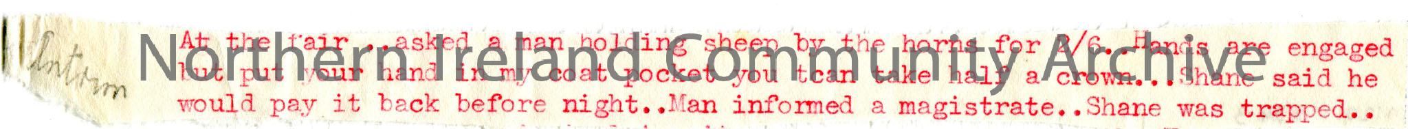 Typed strip of paper re Shane Crossagh borrowing money from a man at a fair. Co Antrim handwritten in pencil beside note.