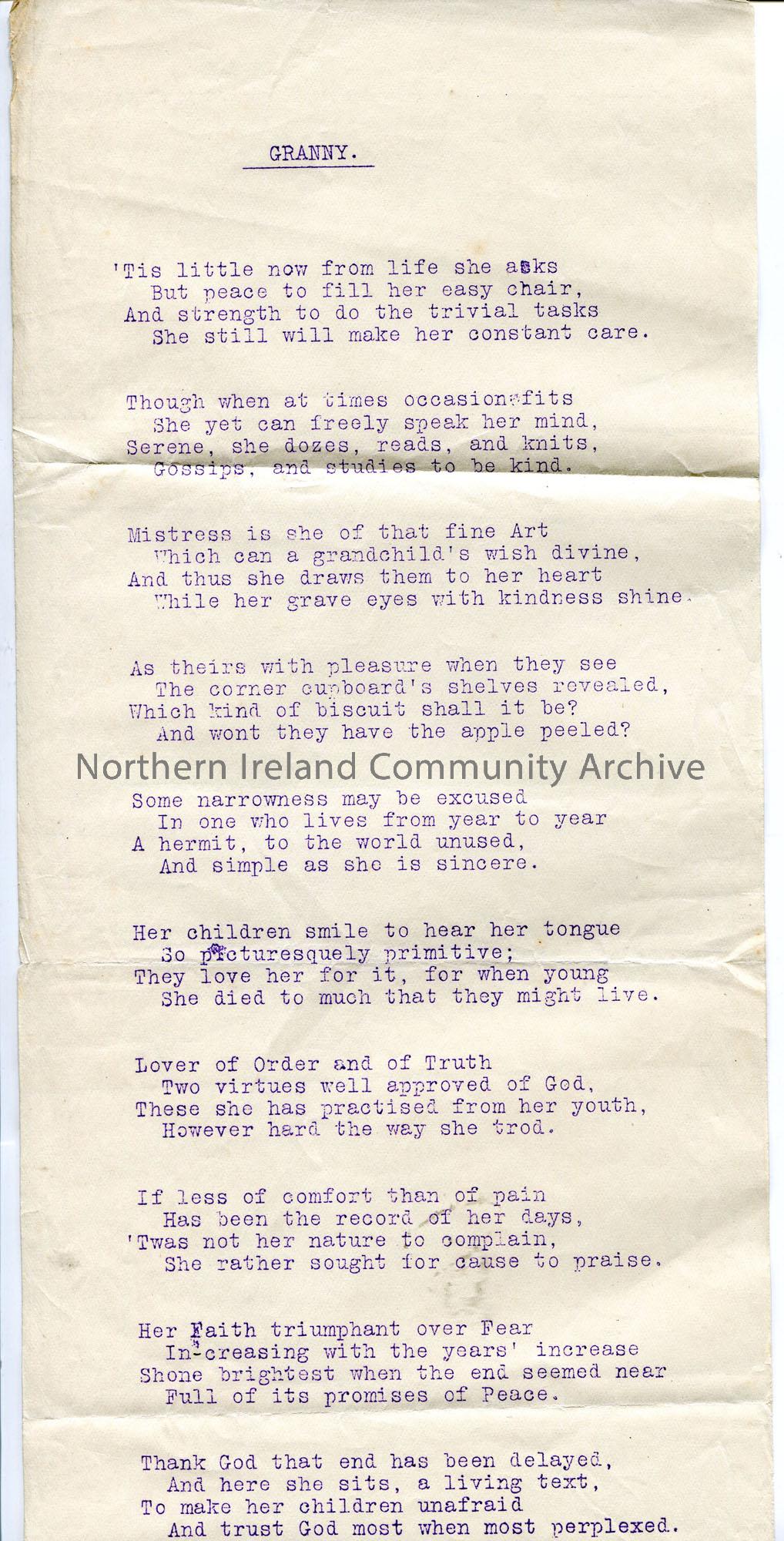 Typed ten verses of a poem or words to song titled, ‘Granny’.