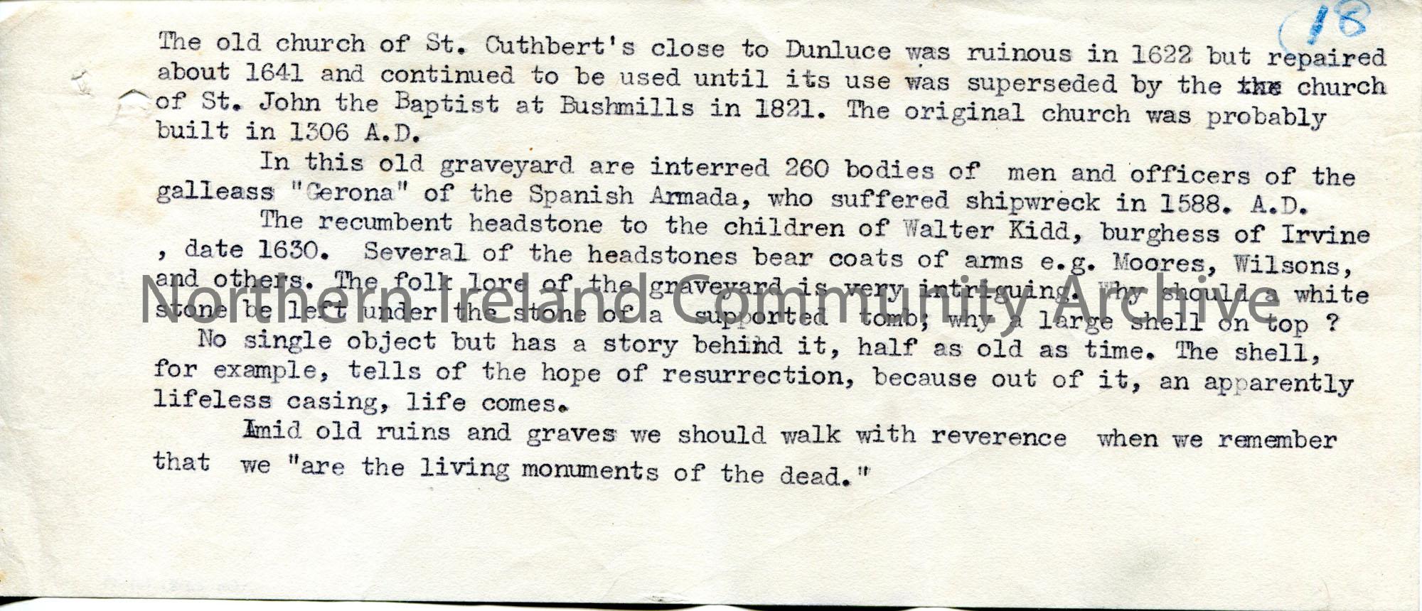 Typed text for Sam Henry's book 'Dunluce and Giant's Causeway'. Typed draft version on strip of paper. Re old church of St. Cuthbert's near Dunluce. Circled number '18' in top right corner. One of a bundle of documents in draft form in the making of the book.