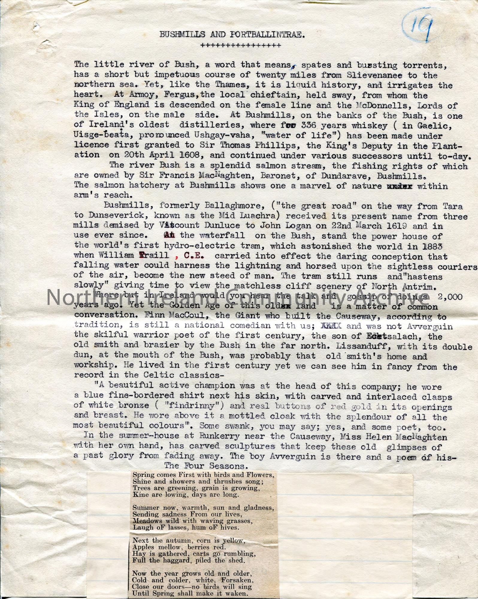 Typed text for Sam Henry's book 'Dunluce and Giant's Causeway'. Typed draft version. Titled, 'Bushmills and Portballintrae'. Newspaper cutting pasted to page of a 4 verse poem titled, 'The Four Seasons' by Avverguin. Circled number '19' in top right corner. One of a bundle of documents in draft form in the making of the book.