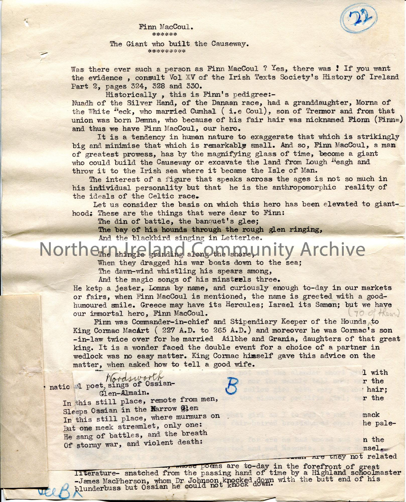 Typed text for Sam Henry's book 'Dunluce and Giant's Causeway'. Typed draft version. Titled, 'Finn MacCoul. The Giant who built the Causeway'. Additional page re Finn's soldiers (Fianna) and their requirements to qualify as soldiers. Circled number '22' in top right corner. One of a bundle of documents in draft form in the making of the book.