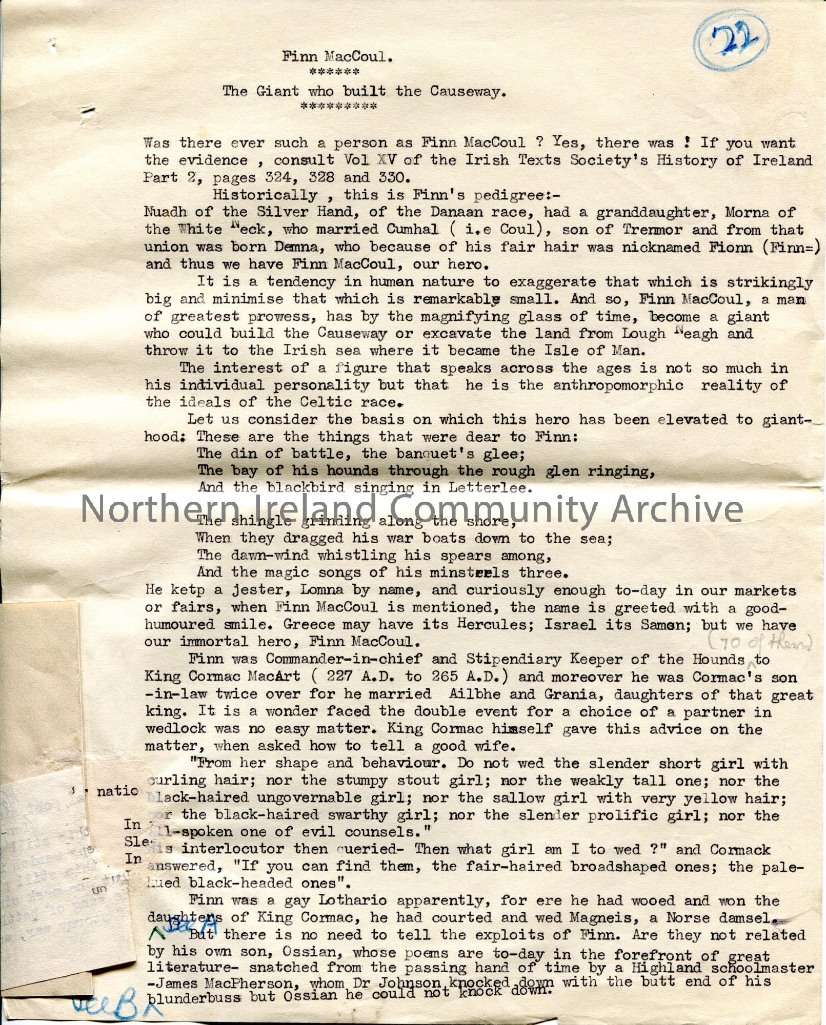 Typed text for Sam Henry's book 'Dunluce and Giant's Causeway'. Typed draft version. Titled, 'Finn MacCoul. The Giant who built the Causeway'. Additional page re Finn's soldiers (Fianna) and their requirements to qualify as soldiers. Circled number '22' in top right corner. One of a bundle of documents in draft form in the making of the book.