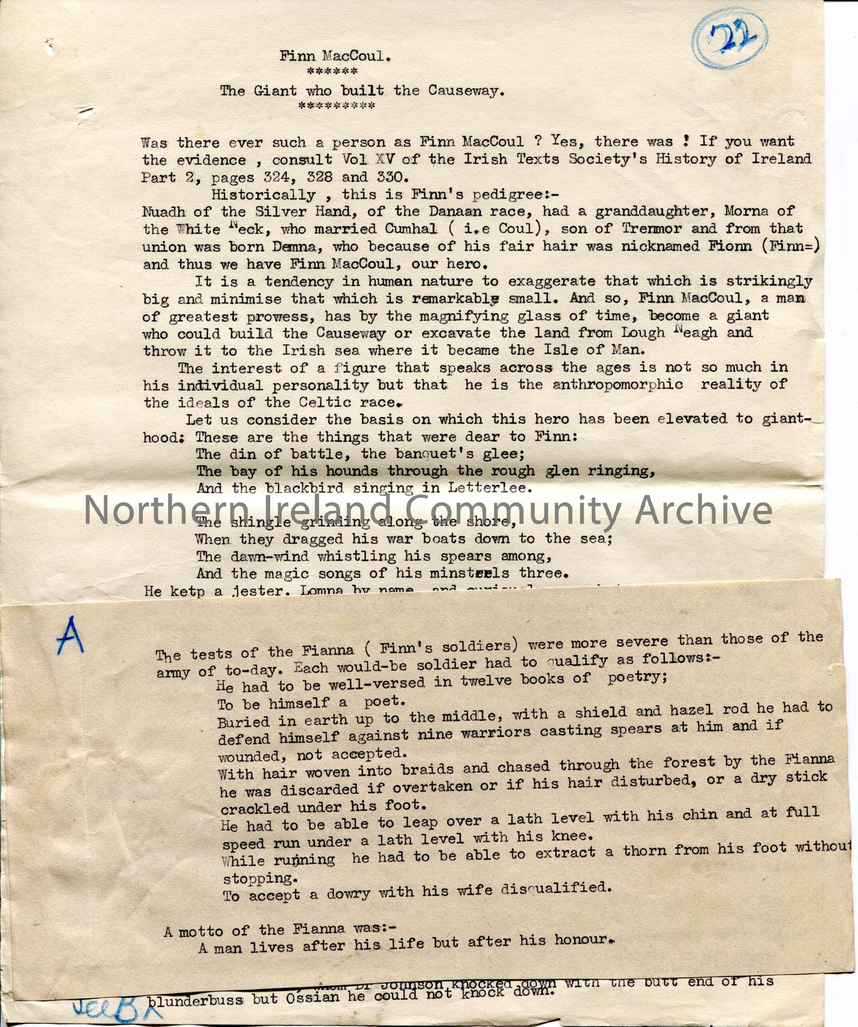 Typed text for Sam Henry's book 'Dunluce and Giant's Causeway'. Typed draft version. Titled, 'Finn MacCoul. The Giant who built the Causeway'. Additional page re Finn's soldiers (Fianna) and their requirements to qualify as soldiers. Circled number '22' in top right corner. One of a bundle of documents in draft form in the making of the book.