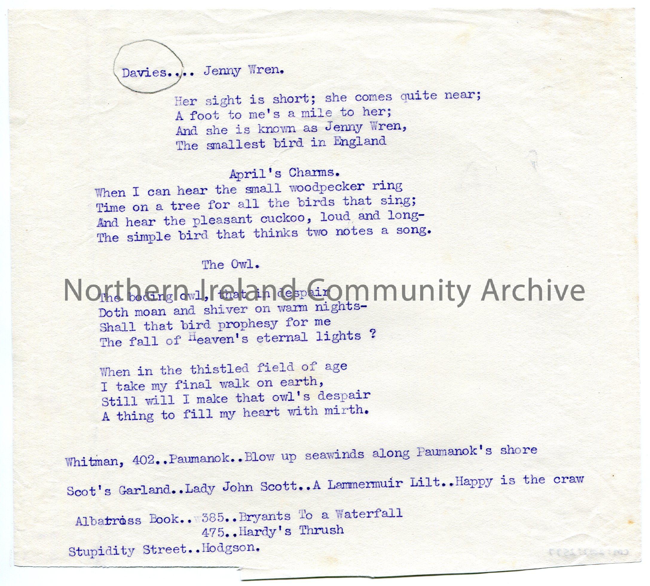 Typed three short poems re birds titled, ‘Jenny Wren’, ‘April’s Charms’ and ‘The Owl’.