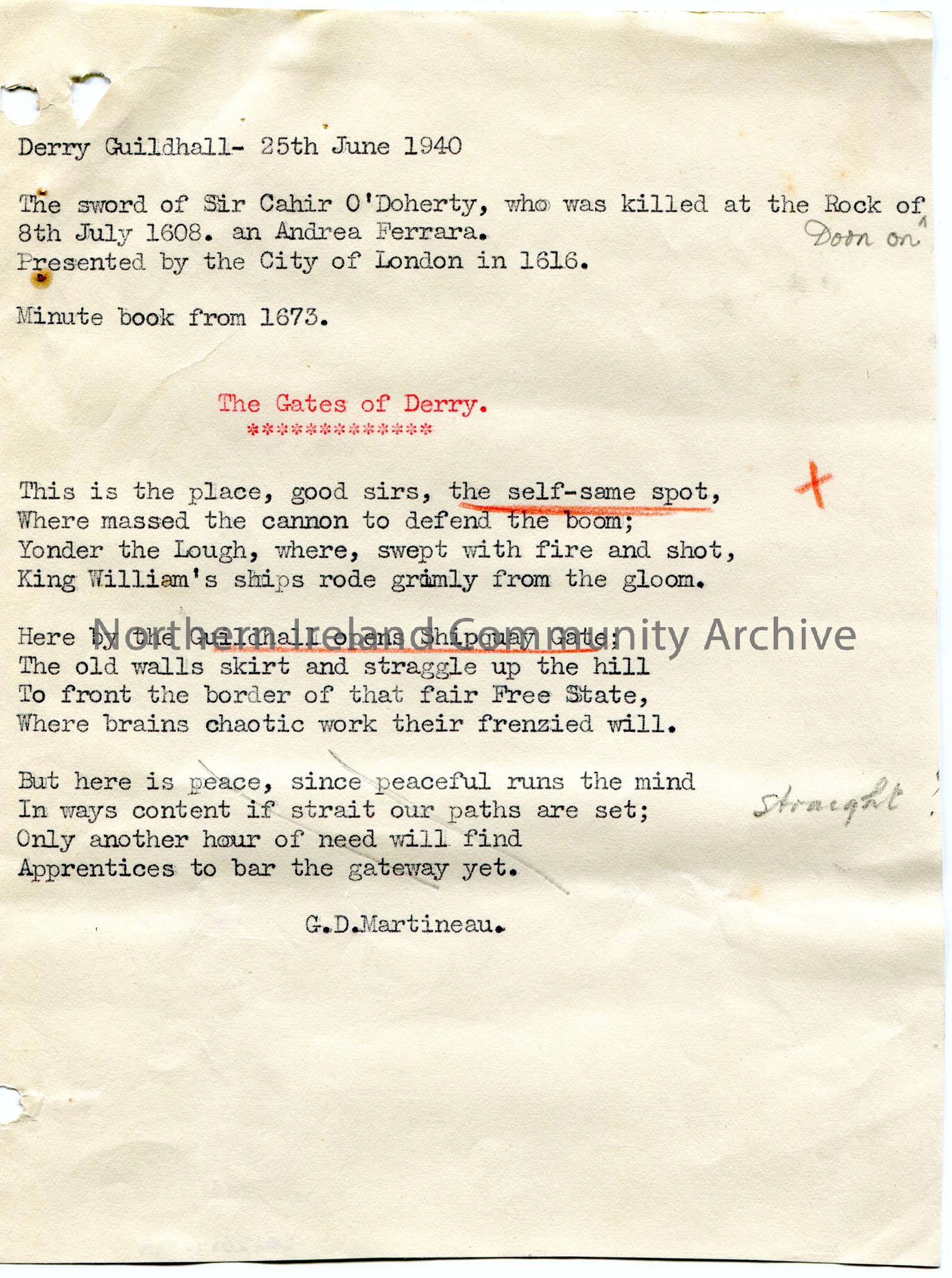 Typed three verses of a poem or words to a song titled, 'The Gates of Derry', by G.D.Martineau. Last verse scored out. Mentions the Guildhall and Shipquay Gate. Typed notes re Derry, the sword of Sir Cahir O'Doherty killed at the Rock of Doon.