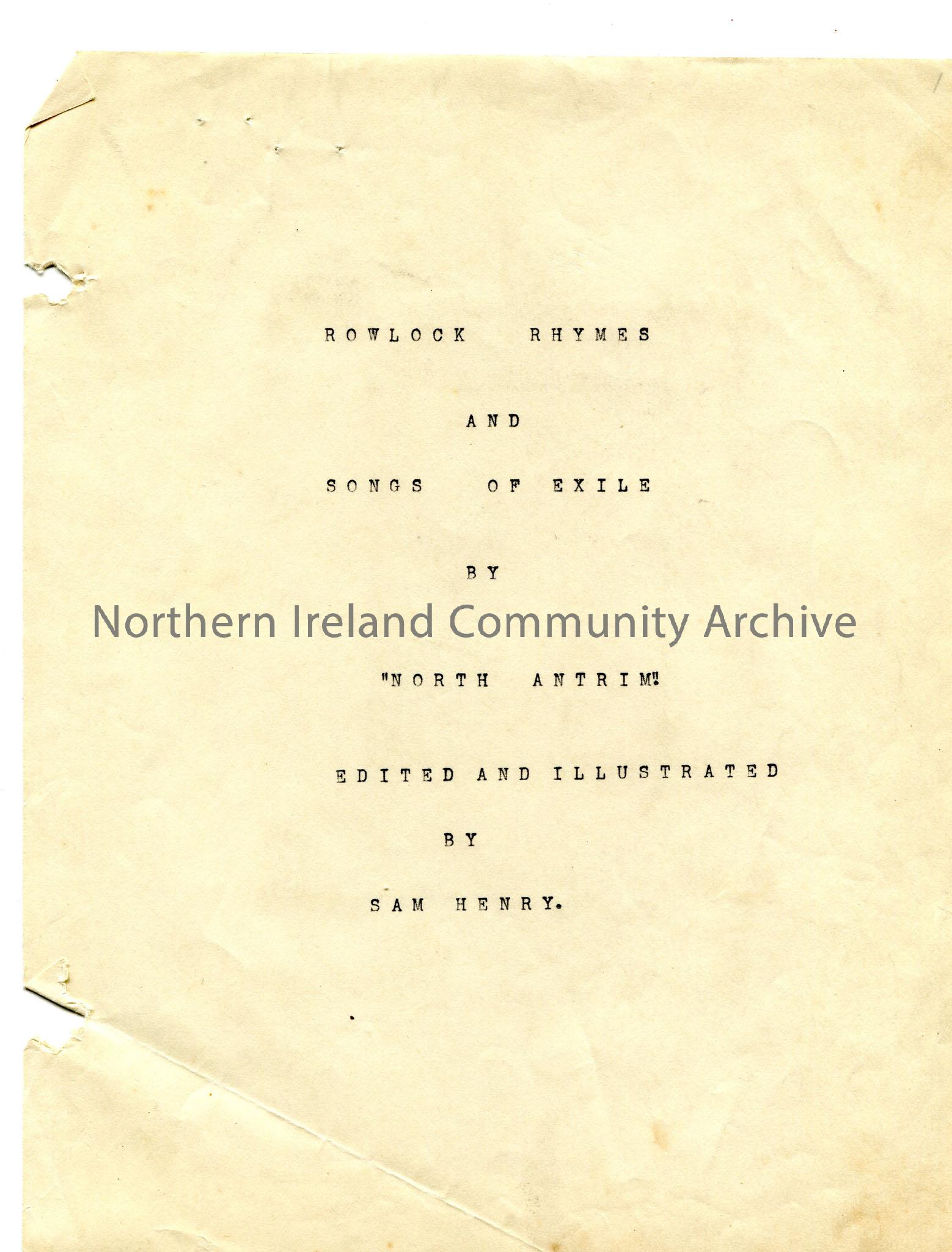 Typed title page for the book. Page from loose manuscript of Rowlock Rhymes and Songs of Exile- a book of verse edited by Sam Henry. The author, Robert McMullan from Portballintrae, had the pen name 'North Antrim' and was "imbued with the Celtic spirit" and interested in the fishermen of the north coast of Antrim