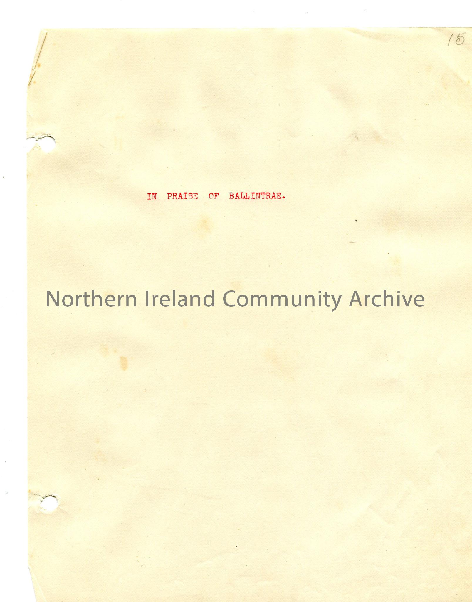 Typed title page - 'In Praise of Ballintrae'. Page from loose manuscript of Rowlock Rhymes and Songs of Exile- a book of verse edited by Sam Henry. The author, Robert McMullan from Portballintrae, had the pen name 'North Antrim' and was "imbued with the Celtic spirit" and interested in the fishermen of the north coast of Antrim