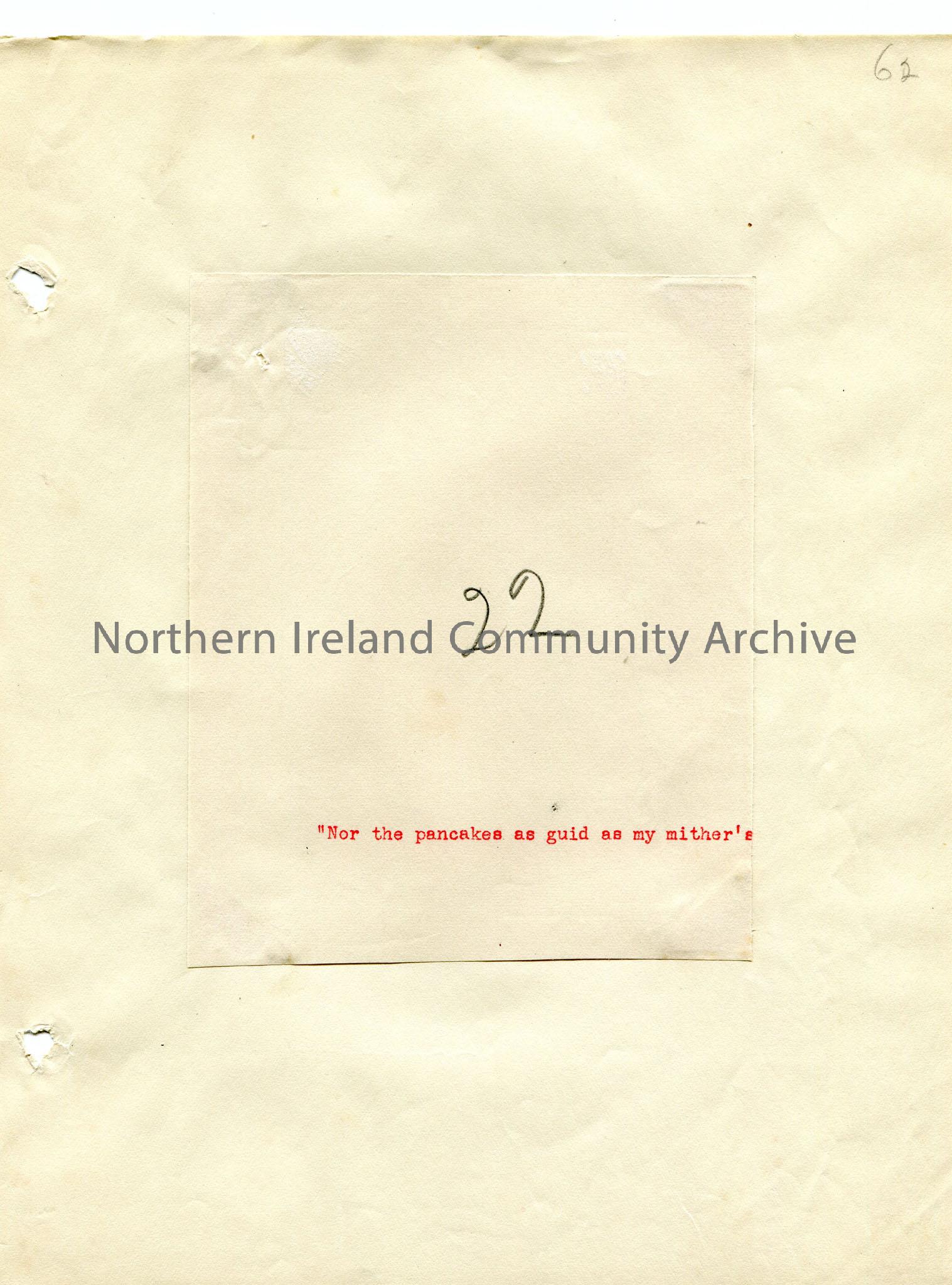 Typed title page 'Nor the pancakes as guid as my mither's' - affixed to page. Uses local dialect. Page from loose manuscript of Rowlock Rhymes and Songs of Exile- a book of verse edited by Sam Henry. The author, Robert McMullan from Portballintrae, had the pen name 'North Antrim' and was "imbued with the Celtic spirit" and interested in the fishermen of the north coast of Antrim