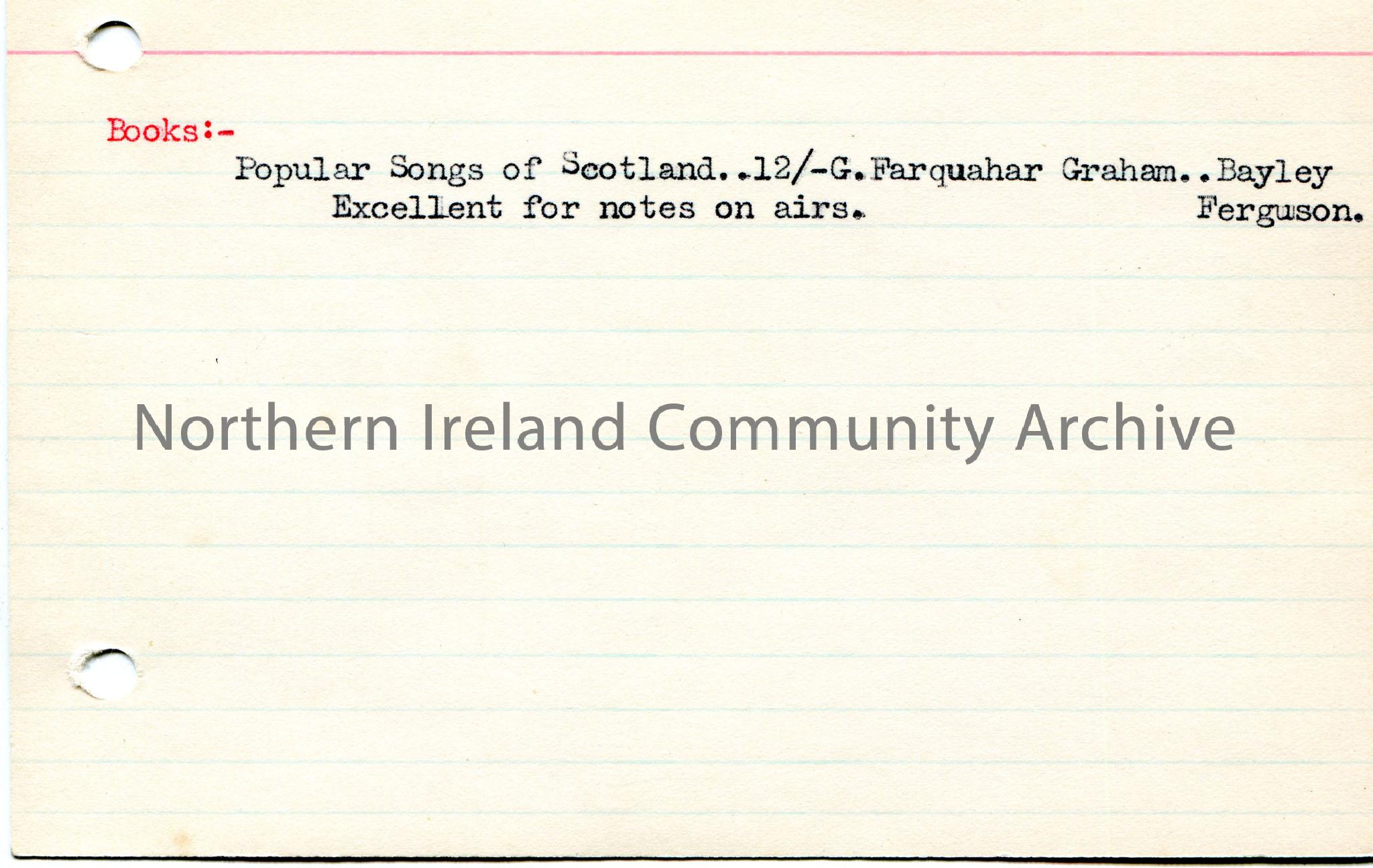 Typed titled of a book – Popular Songs of Scotland, ‘Excellent for notes on airs’ typed below.