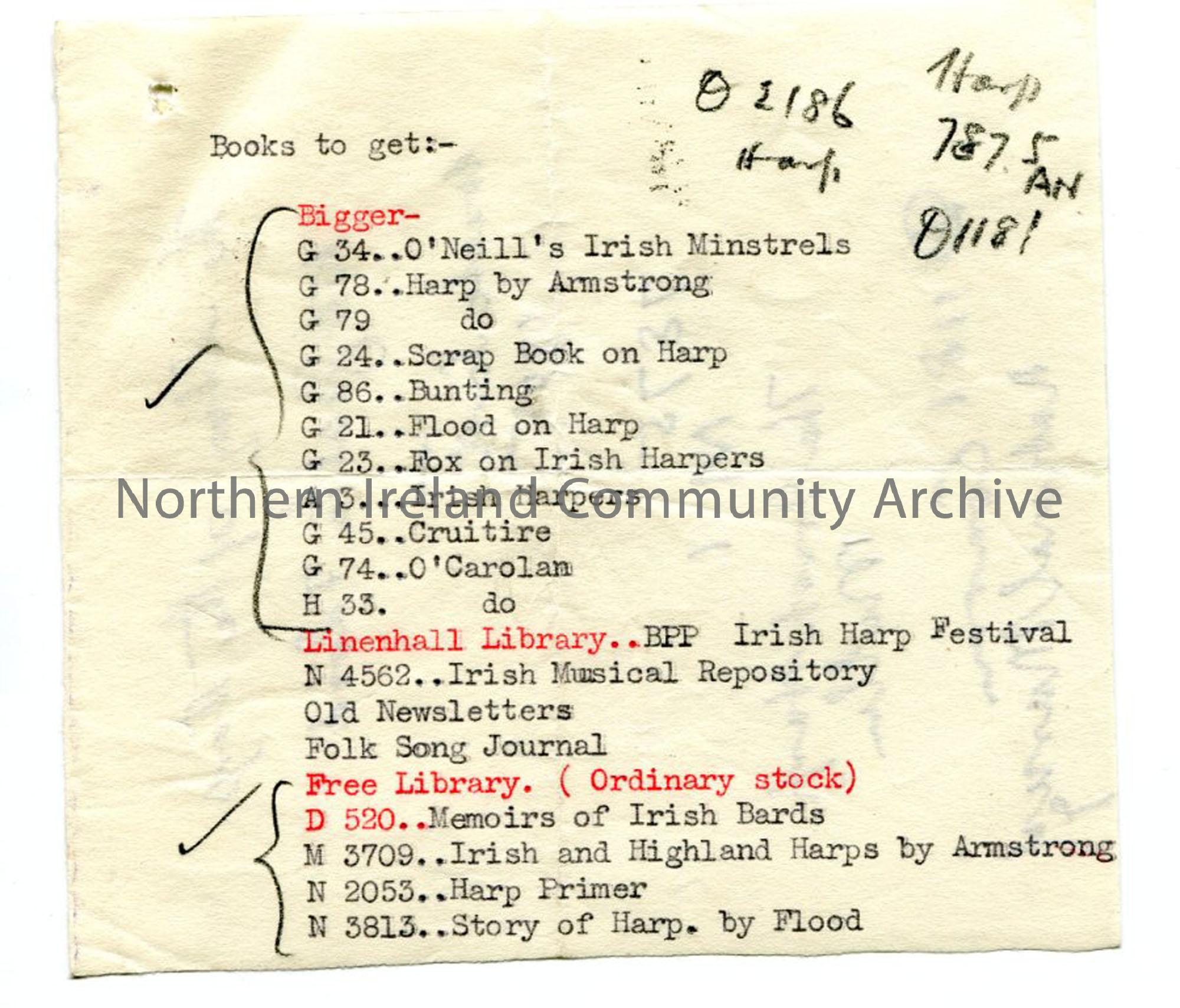 Typed titles of books on harps