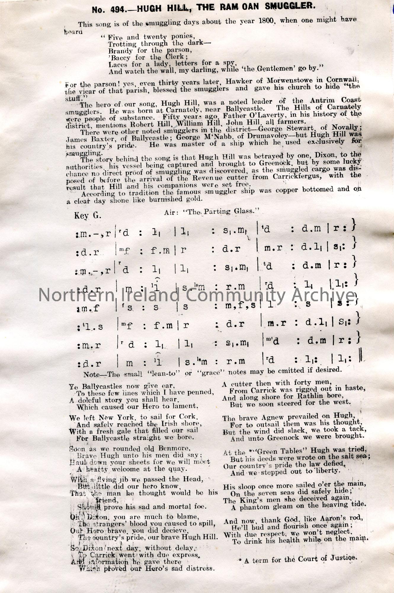 Typed tonic sol-fa and words to song titled, 'No. 494 - Hugh Hill, The Ramoan Smuggler'. Refers to Hugh Hill - a noted leader of the Antrim Coast smugglers.