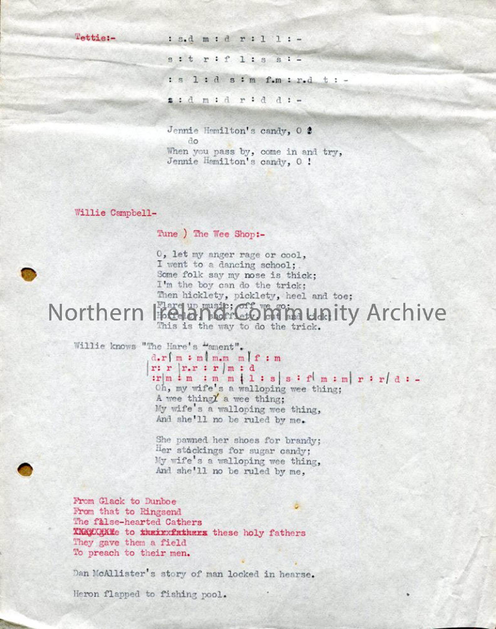 Typed tonic sol-fa and words to various songs. Including the tune to 'The Wee Shop'.