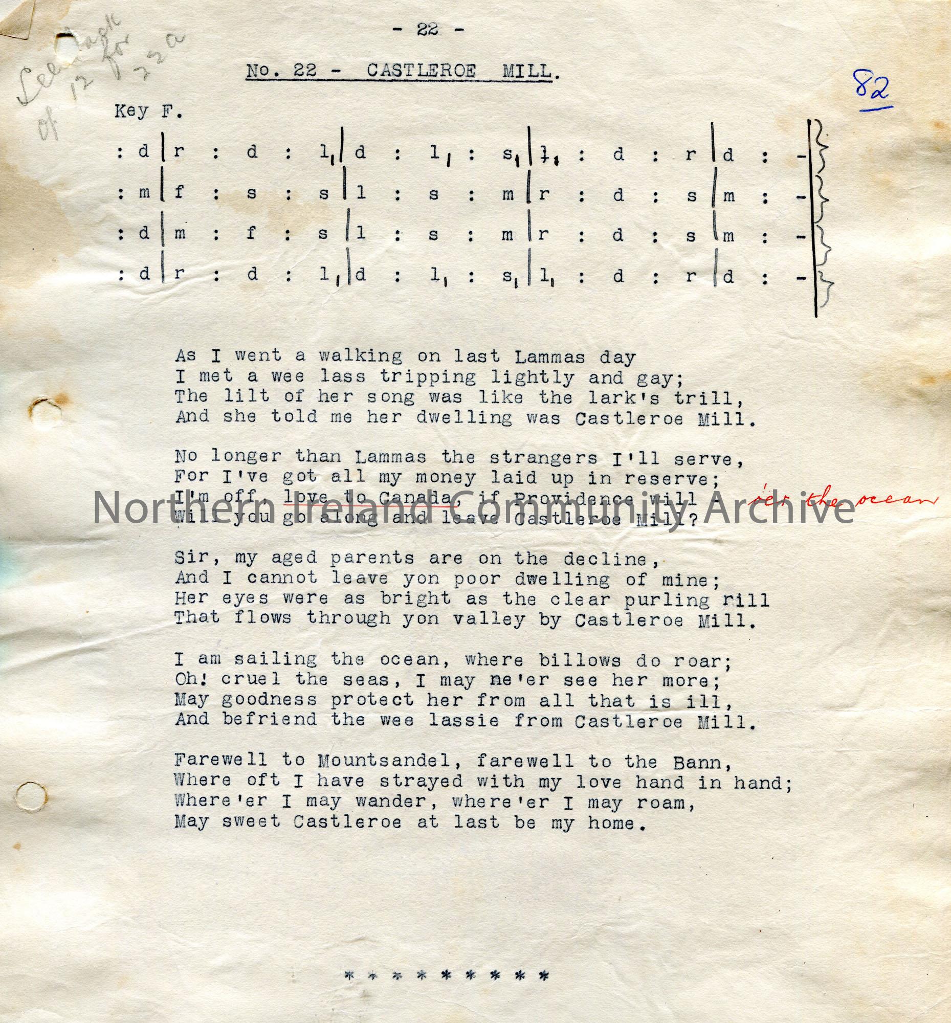 Typed tonic sol-fa notation and word to song titled, ‘No. 22 – Castleroe Mill’.