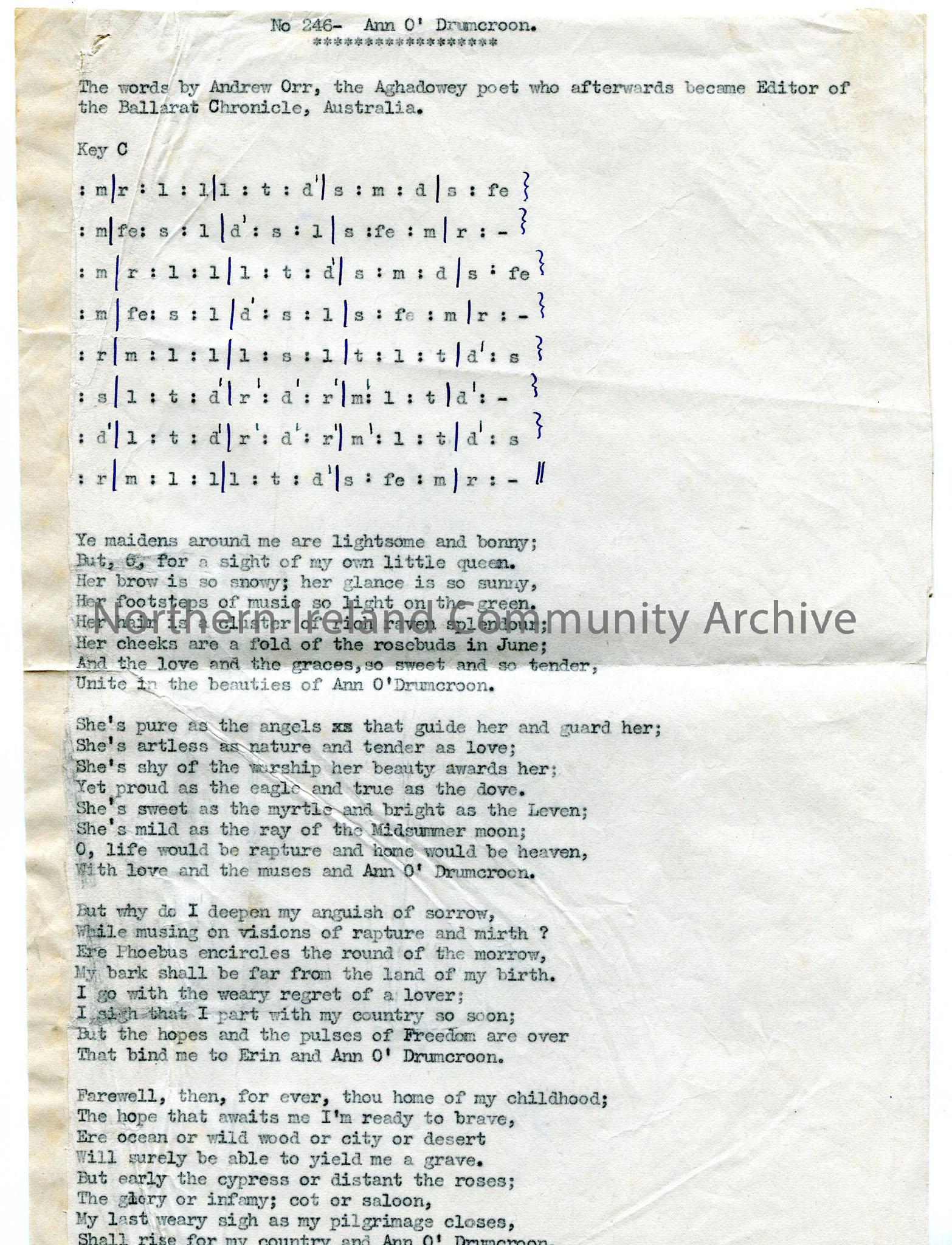 Typed tonic sol-fa notation and words to 'Ann O' Drumcroon' by Andrew Orr.
