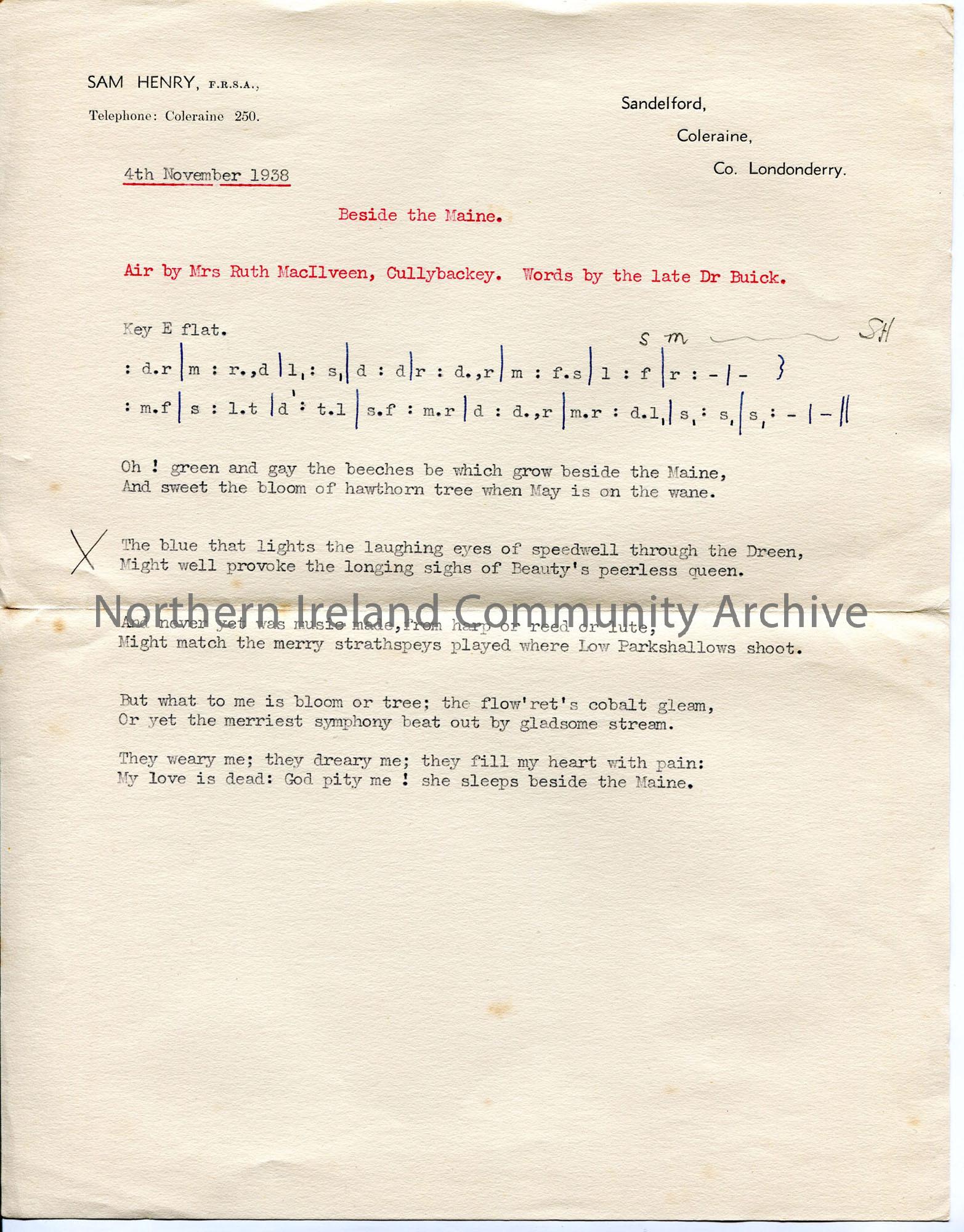 Typed tonic sol-fa notation and words to ‘Beside the Maine’